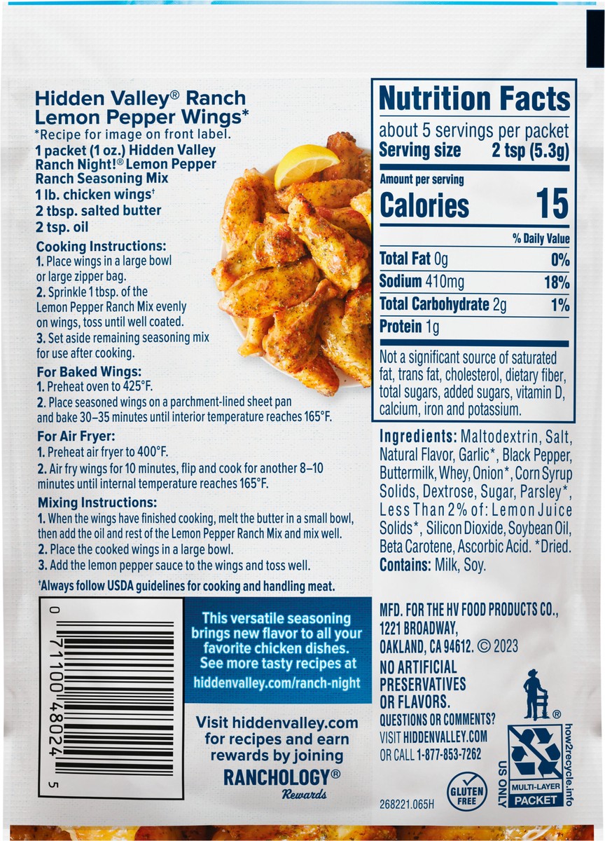 Elevate your weekday dinners with Hidden Valley Lemon Pepper Ranch Premium Recipe Mix. Made with a blend of onions, spices, zesty lemon, black pepper and tangy buttermilk, this Hidden Valley Ranch sea…