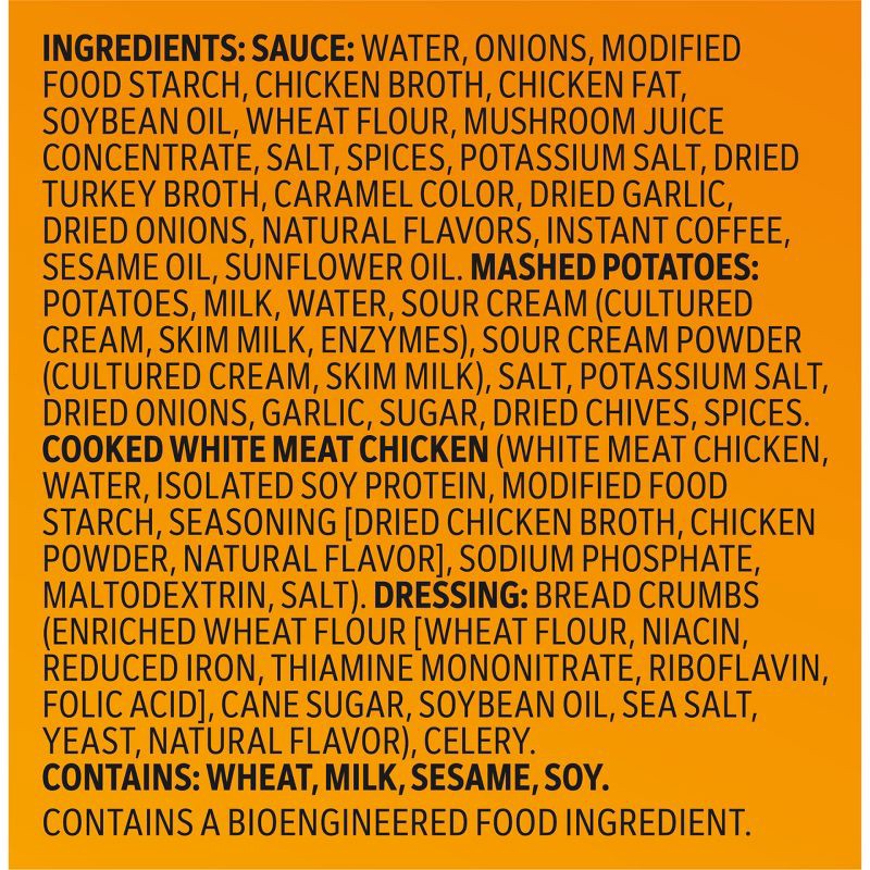 SAUCE: WATER, ONIONS, MODIFIED FOOD STARCH, CHICKEN BROTH, CHICKEN FAT, SOYBEAN OIL, WHEAT FLOUR, MUSHROOM JUICE CONCENTRATE, SALT, SPICES, POTASSIUM SALT, DRIED TURKEY BROTH, CARAMEL COLOR, DRIED GAR…