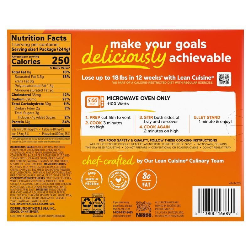 - CHEF CRAFTED: Our chefs work side-by-side with dietitians to create ridiculously tasty frozen Lean Cuisine meals. This dish features baked chicken with stuffing, mashed potatoes and gravy