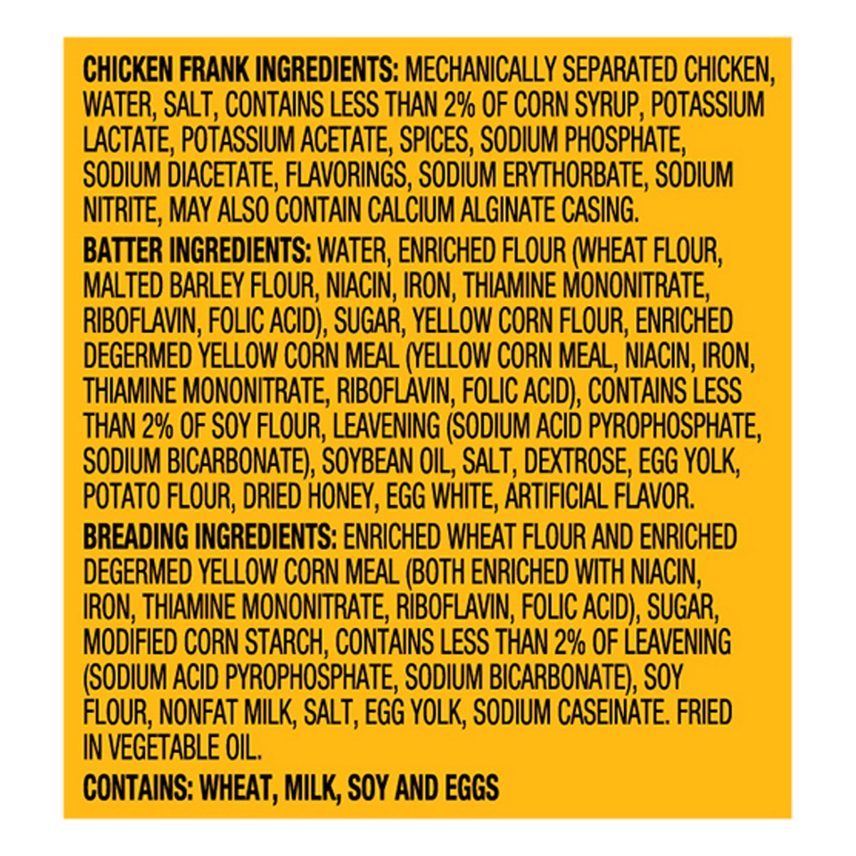Chicken frank: contains: wheat, milk, soy and eggs.,batter: contains: wheat, milk, soy and eggs.,breading: contains: wheat, milk, soy and eggs.