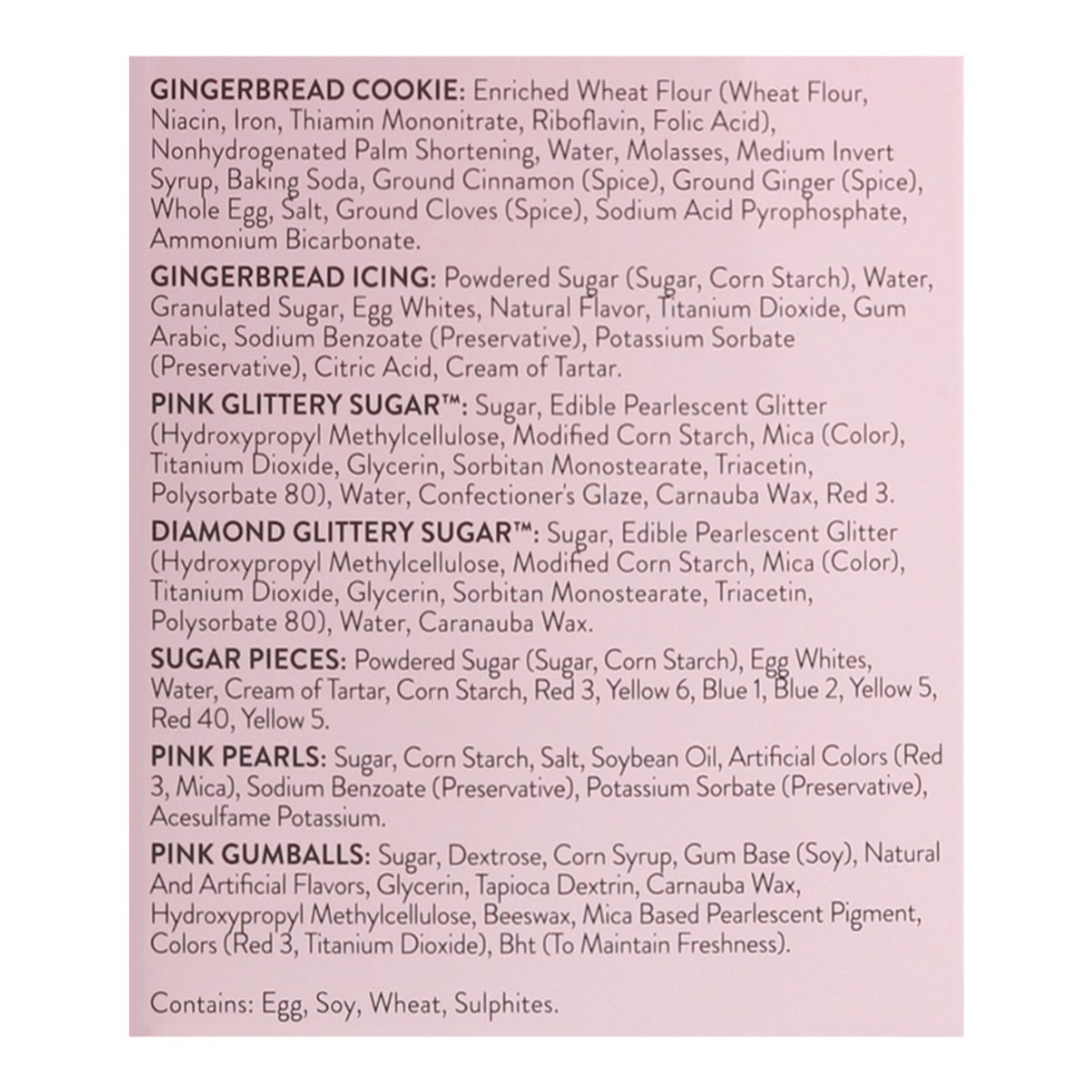 Gingerbread Cookie: Enriched Wheat Flour (Wheat Flour, Niacin, Iron, Thiamin Mononitrate, Riboflavin, Folic Acid), Non Hydrogenated Palm Shortening, Water, Molasses, Medium Invert Syrup, Baking Soda, …