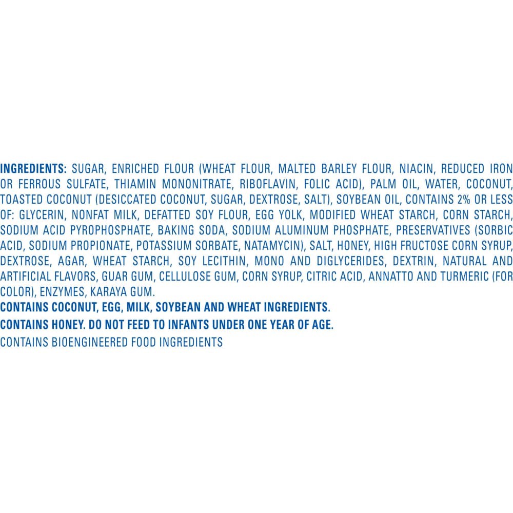 Sugar, Enriched Flour (Wheat Flour, Malted Barley Flour, Niacin, Reduced Iron or Ferrous Sulfate, Thiamin Mononitrate, Riboflavin, Folic Acid), Palm Oil, Water, Coconut, Toasted Coconut (Desiccated Co…