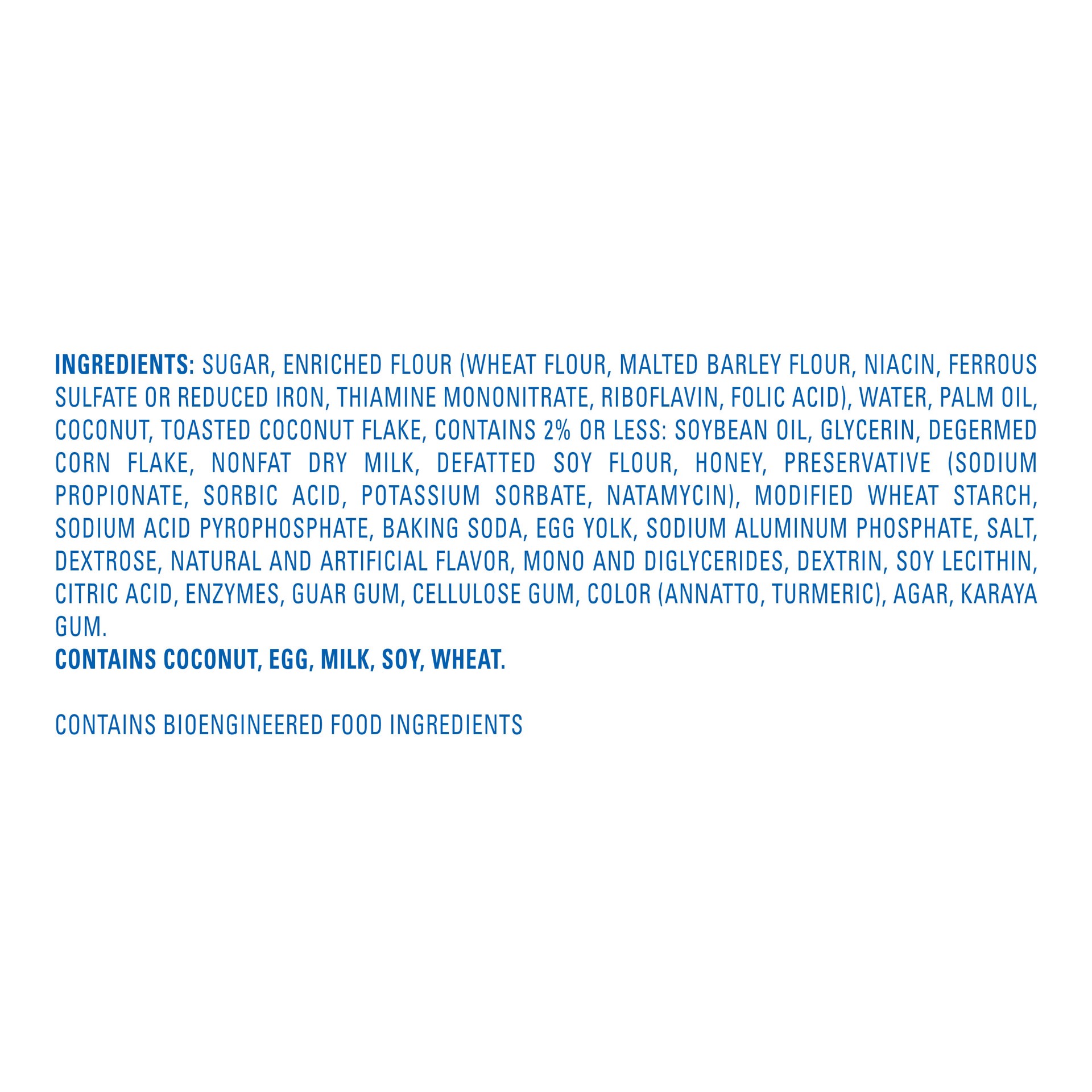 Sugar, Enriched Flour (Wheat Flour, Malted Barley Flour, Niacin, Reduced Iron or Ferrous Sulfate, Thiamin Mononitrate, Riboflavin, Folic Acid), Palm Oil, Water, Coconut, Toasted Coconut (Desiccated Co…