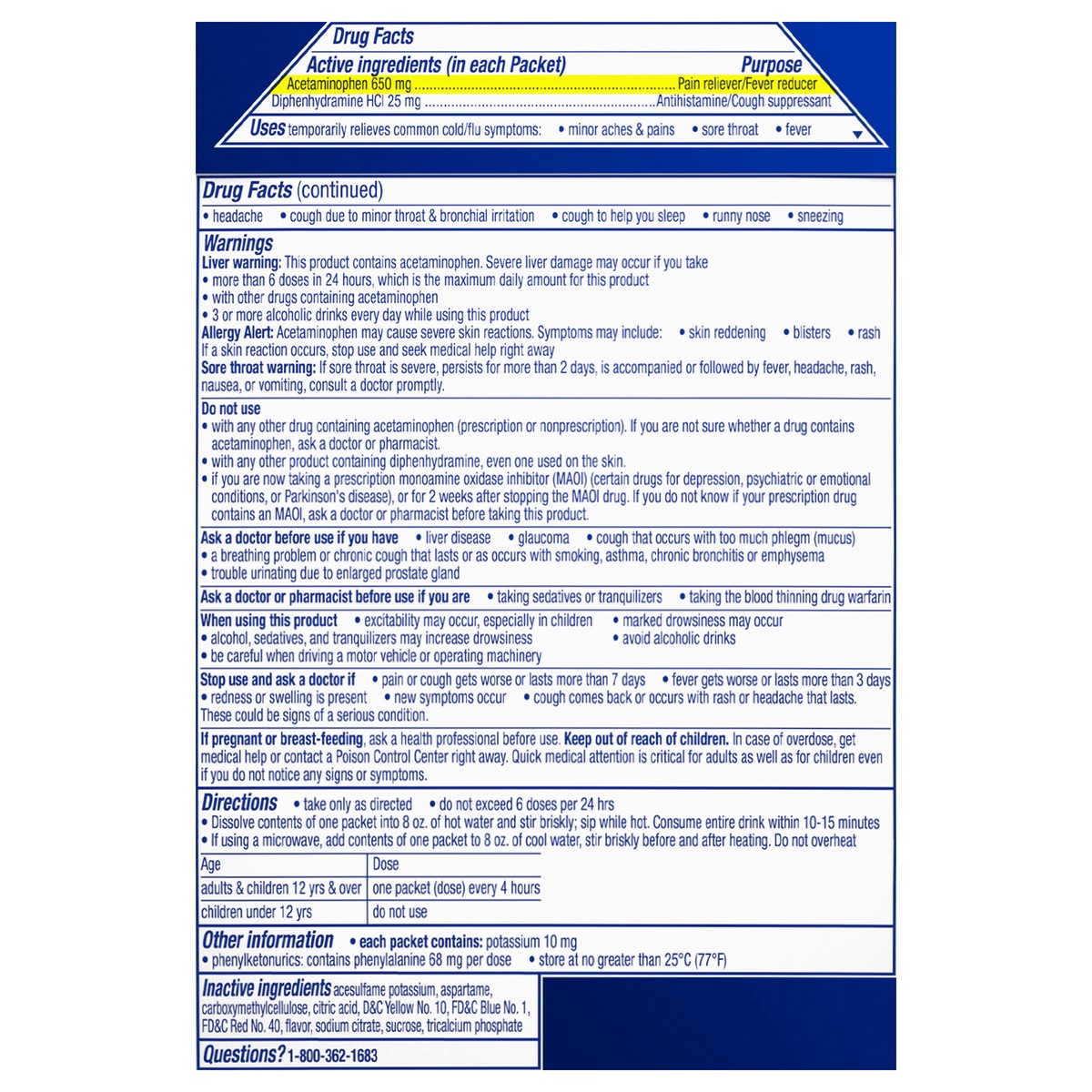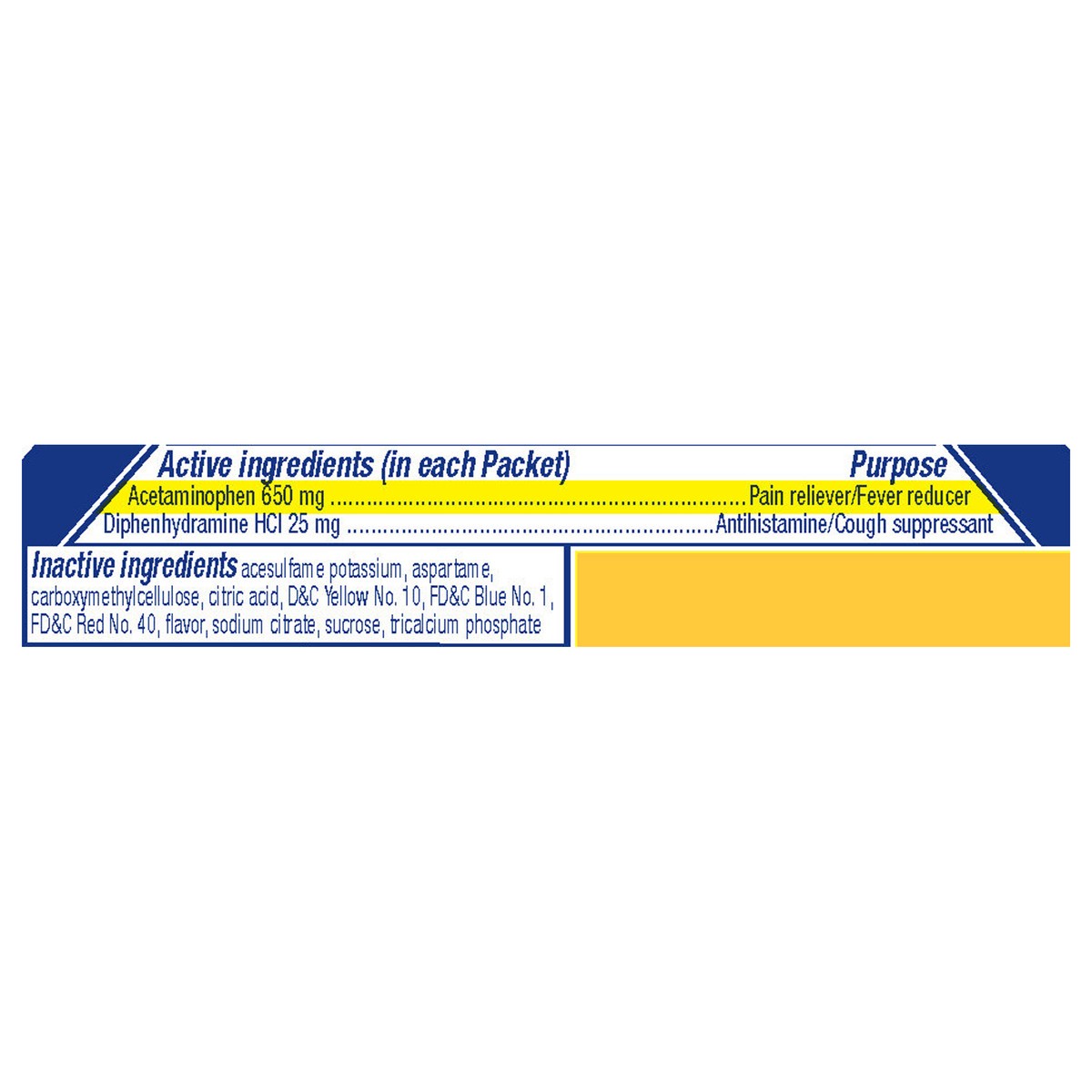 In Each Packet: Active Ingredients: Acetaminophen (650 mg), Pain Reliever/Fever Reducer; Diphenhydramine HCI (25 mg), Antihistamine/Cough Suppressant. Inactive Ingredients: Acesulfame Potassium, Aspar…