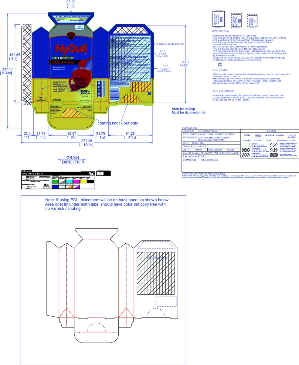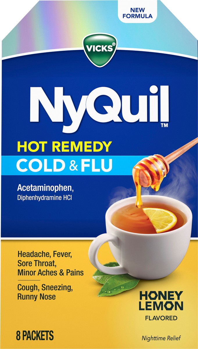 - FAST, SOOTHING MULTI-SYMPTOM RELIEF. NyQuil Hot Remedy helps relieve your cold & flu symptoms fast with two powerful medicines in each easy-to-use powder packet and dissolves quickly in hot water.