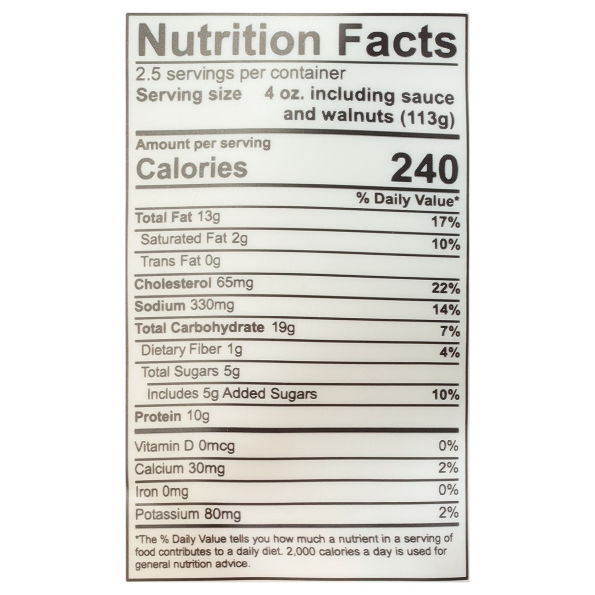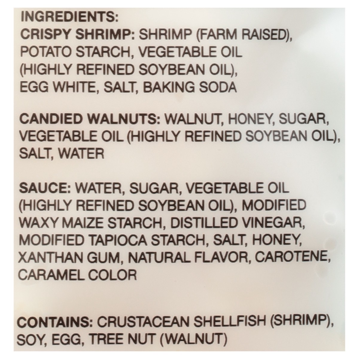 Crispy Shrimp: Shrimp (Farm Raised), Potato, Starch, Vegetable Oil (Highly Refined Soybean Oil), Egg White, Salt, Baking Soda, Candied Walnuts: Walnut Honey, Sugar, Vegetable Oil (Highly Refined Soybe…