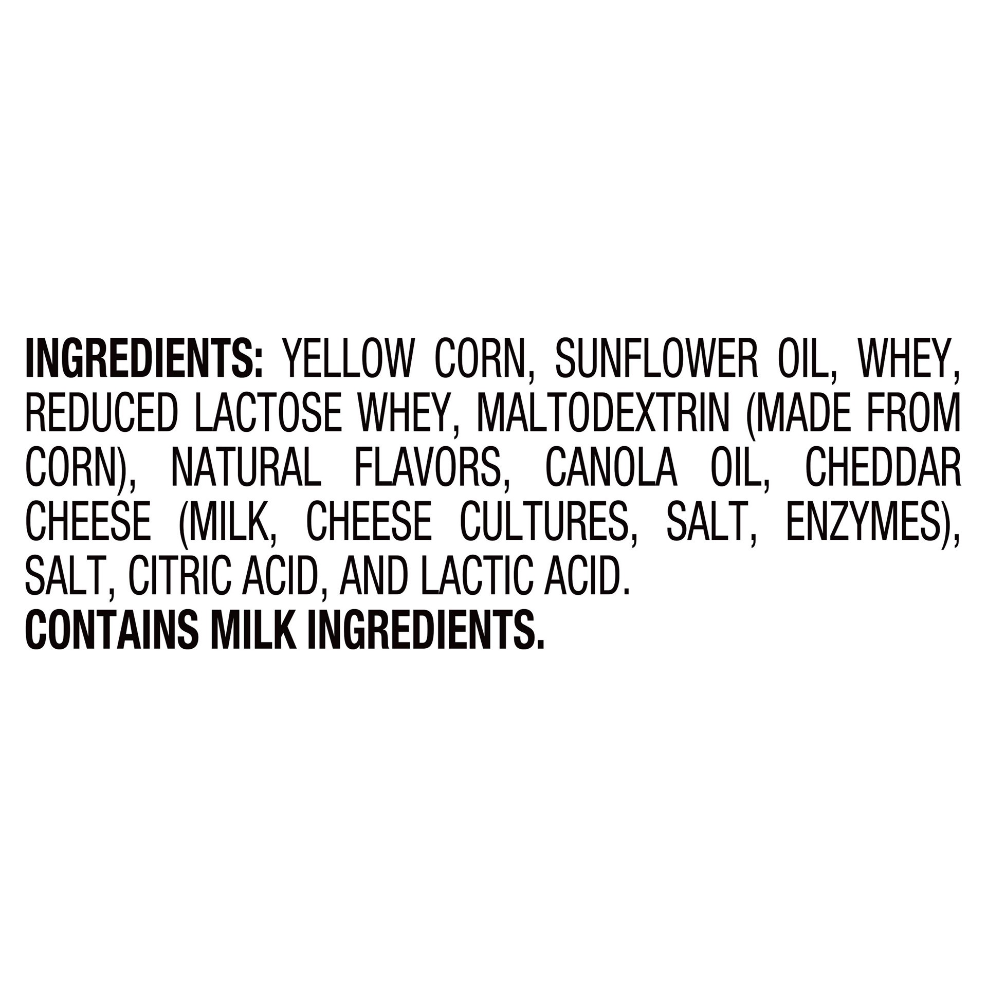 Yellow Corn, Sunflower Oil, Whey, Reduced Lactose Whey, Maltodextrin (Made From Corn), Natural Flavors, Canola Oil, Cheddar Cheese (Milk, Cheese Cultures, Salt, Enzymes), Salt, Citric Acid, And Lactic…