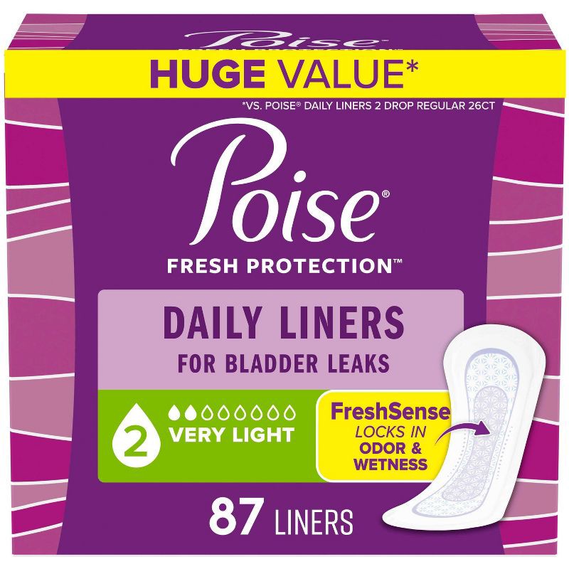 - POISE DAILY LINERS: 87 incontinence and postpartum bladder leak panty liners, 2 Drop Very Light Absorbency, regular length (87 pantiliners total)