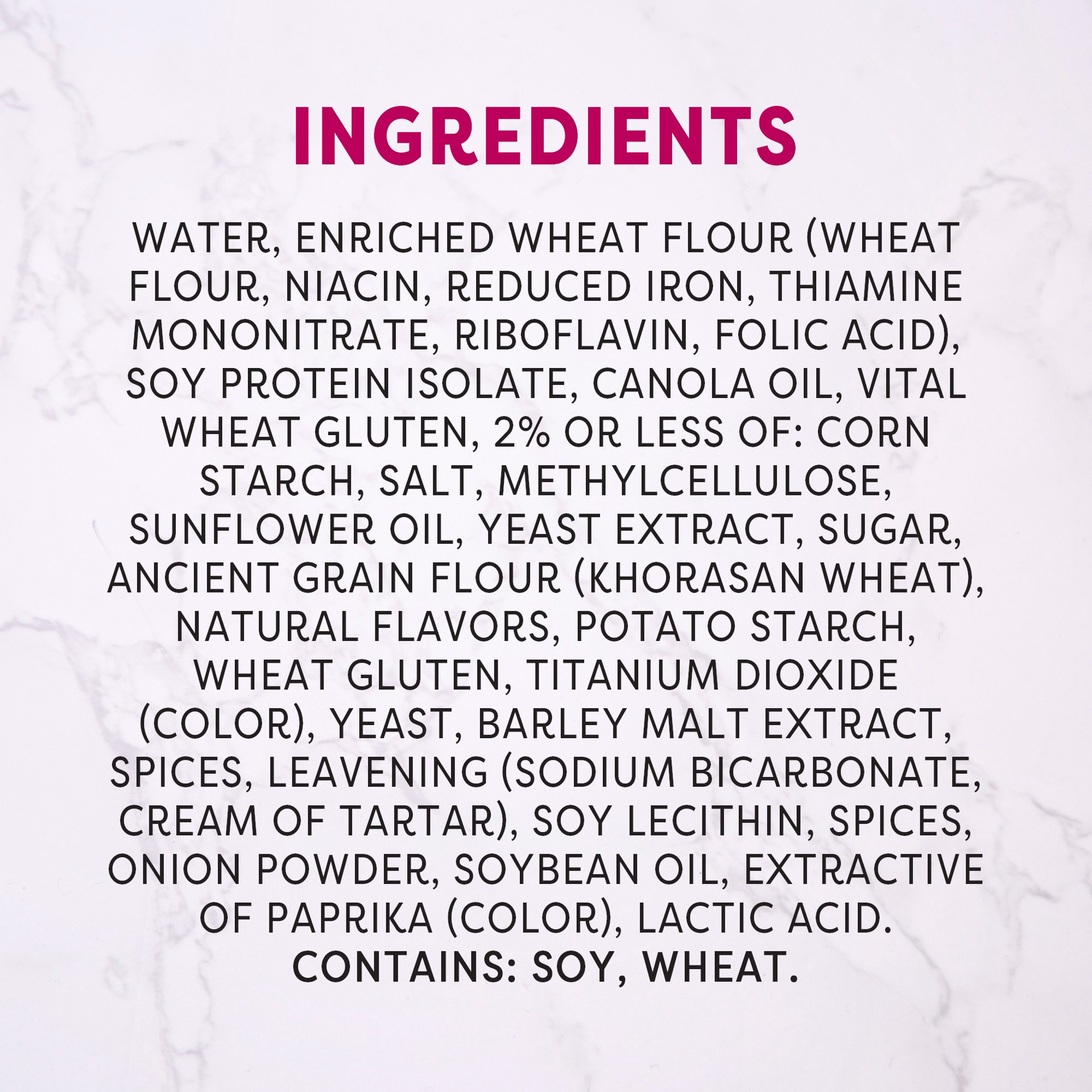 INGREDIENTS: WATER, ENRICHED WHEAT FLOUR (WHEAT FLOUR, NIACIN, REDUCED IRON, THIAMINE MONONITRATE, RIBOFLAVIN, FOLIC ACID), SOY PROTEIN ISOLATE, CANOLA OIL, VITAL WHEAT GLUTEN, 2% OR LESS OF: CORN STA…