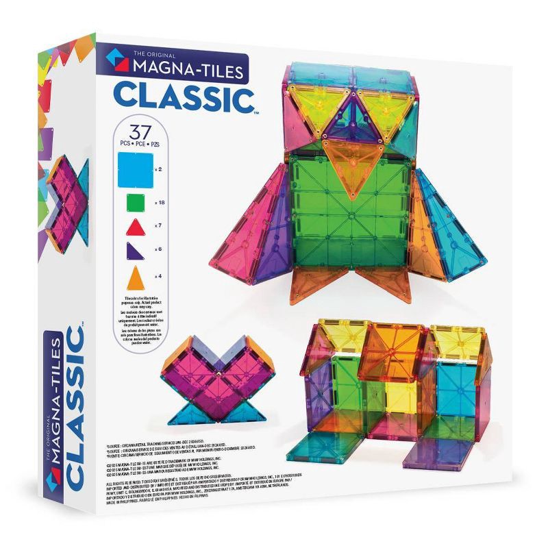 - What's Included: 37 magnetic pieces in 6 classic colors. This MAGNA-TILES® building set includes magnetic tiles with 18 squares, 2 large squares and 17 triangles (7 equilateral, 6 right, 4 isosceles).