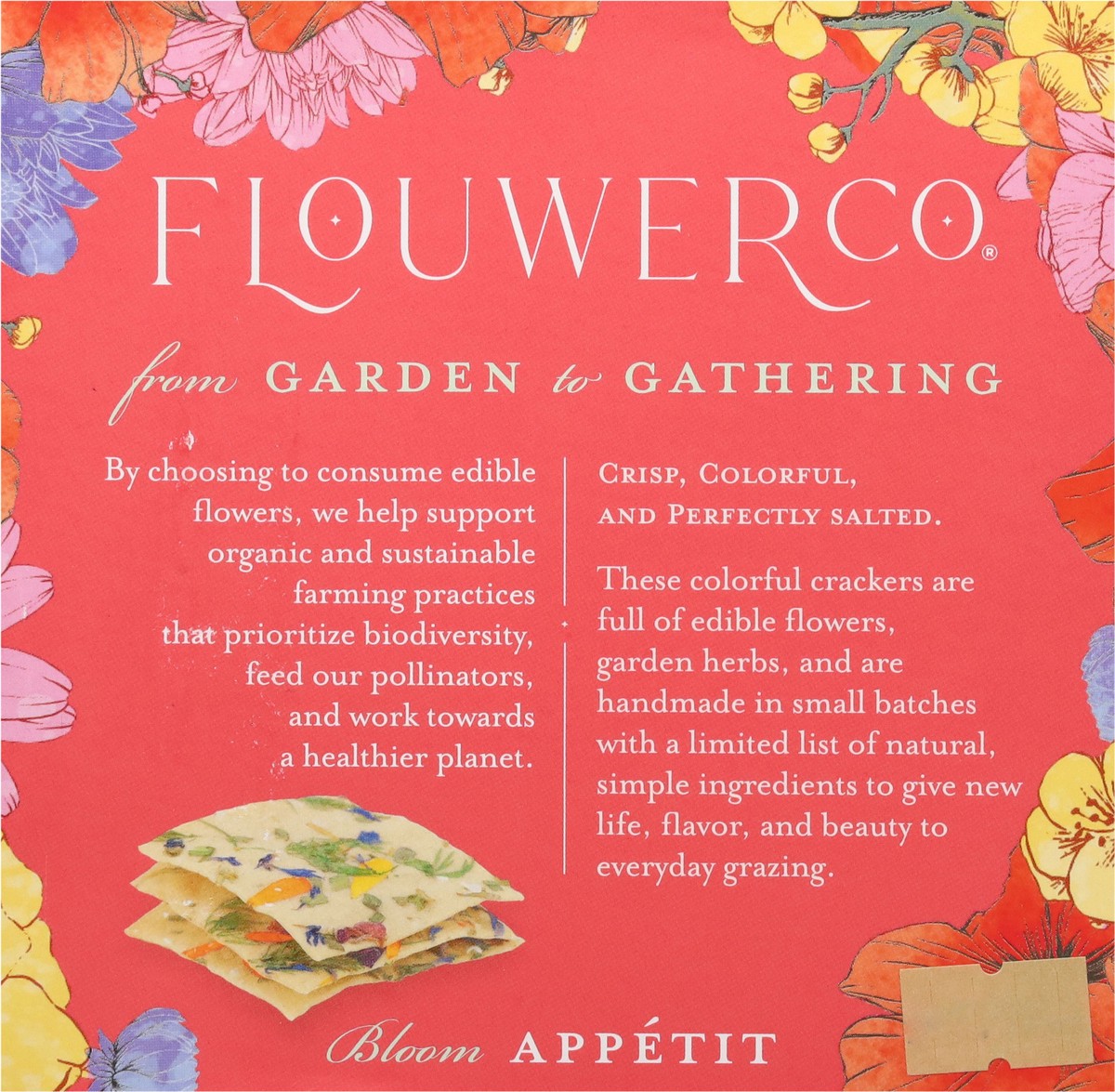 We handcraft all natural, plant-based, artisanal crackers with edible flowers and fresh herbs to give new life, flavor, and beauty to everyday grazing. No.1 is our flagship flavor. This colorful crack…