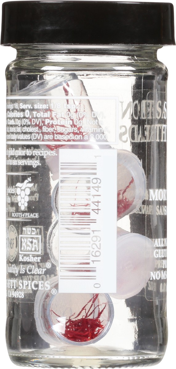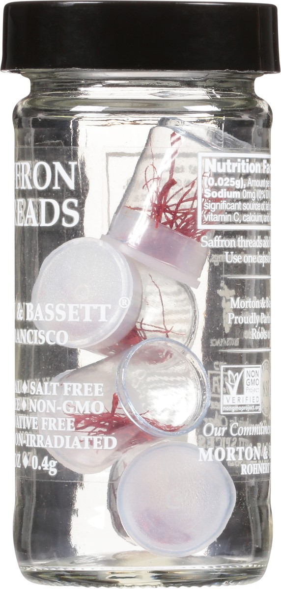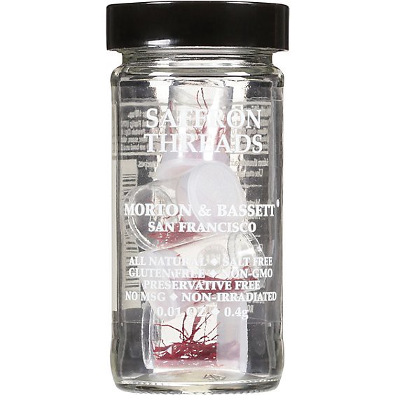 San Francisco. All natural. Preservative free. Non-irradiated. Saffron Threads add brilliant gold color to recipes. Use one capsule for four to six servings. Morton & Bassett Spices proudly partners w…