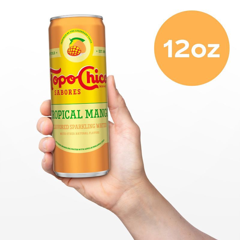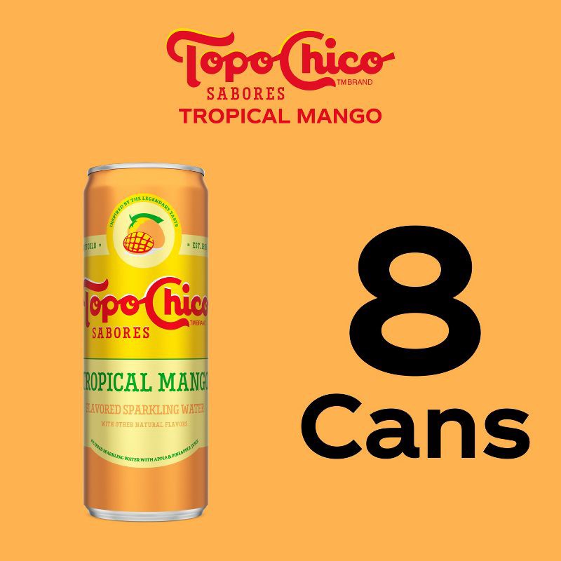 - 8 pack, 12 fluid ounce cans of Topo Chico Sabores Tropical Mango, flavored sparkling water
