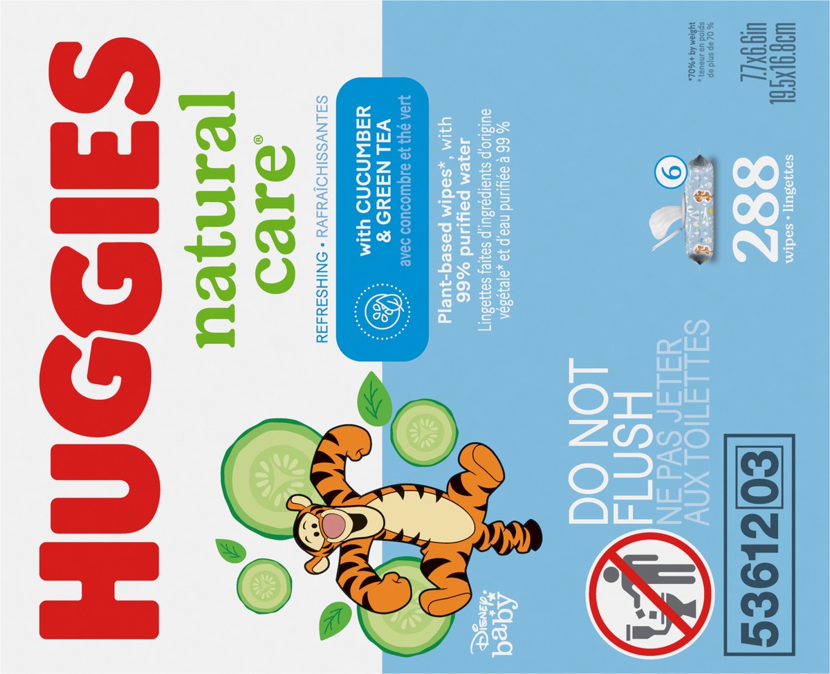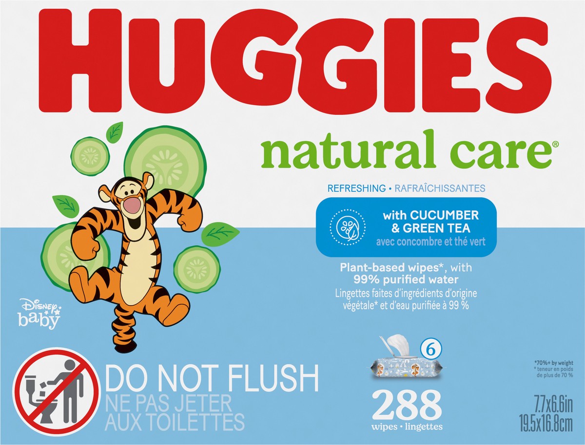 Huggies Natural Care Refreshing Baby Wipes have reliably offered plant-based ingredients since 1990* (*70%+ by weight plant-based materials), are made with 99% purified water and are infused with cucu…