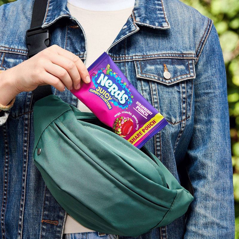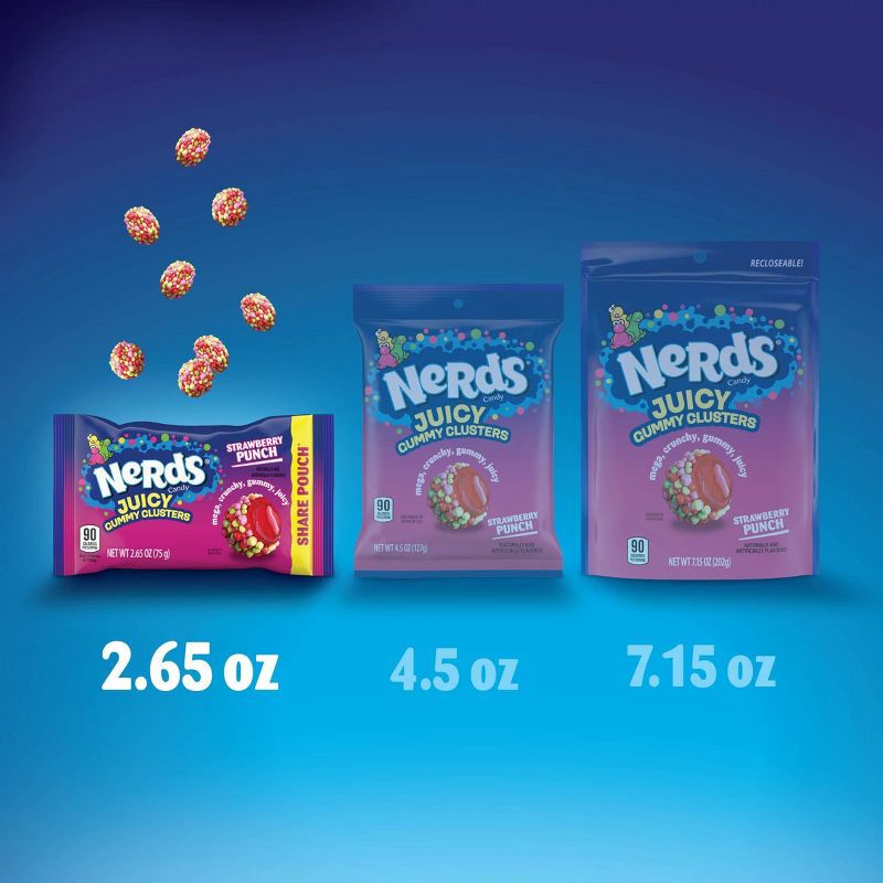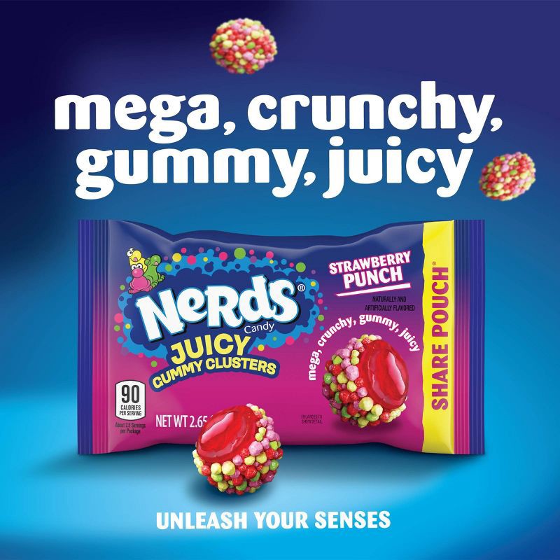 - CRUNCHY, GUMMY AND JUICY CANDY: NERDS Juicy Gummy Clusters is a Strawberry Punch flavored candy in a 2.65 oz share pouch