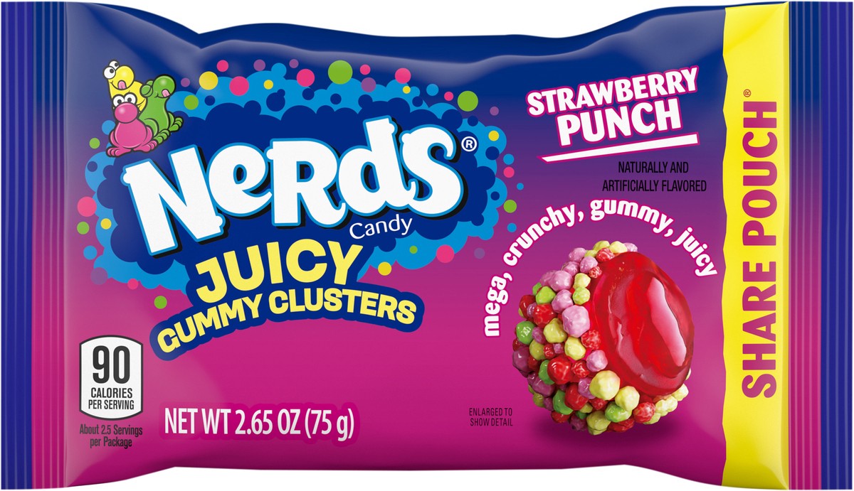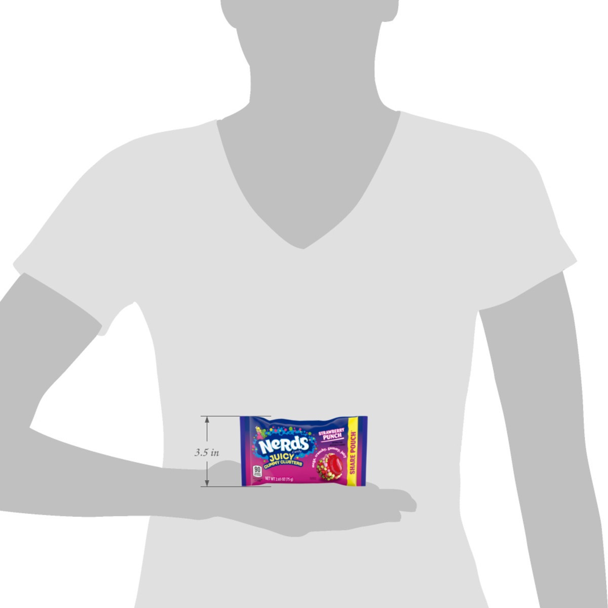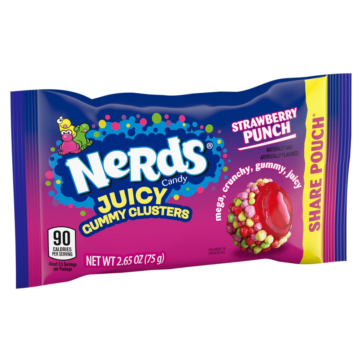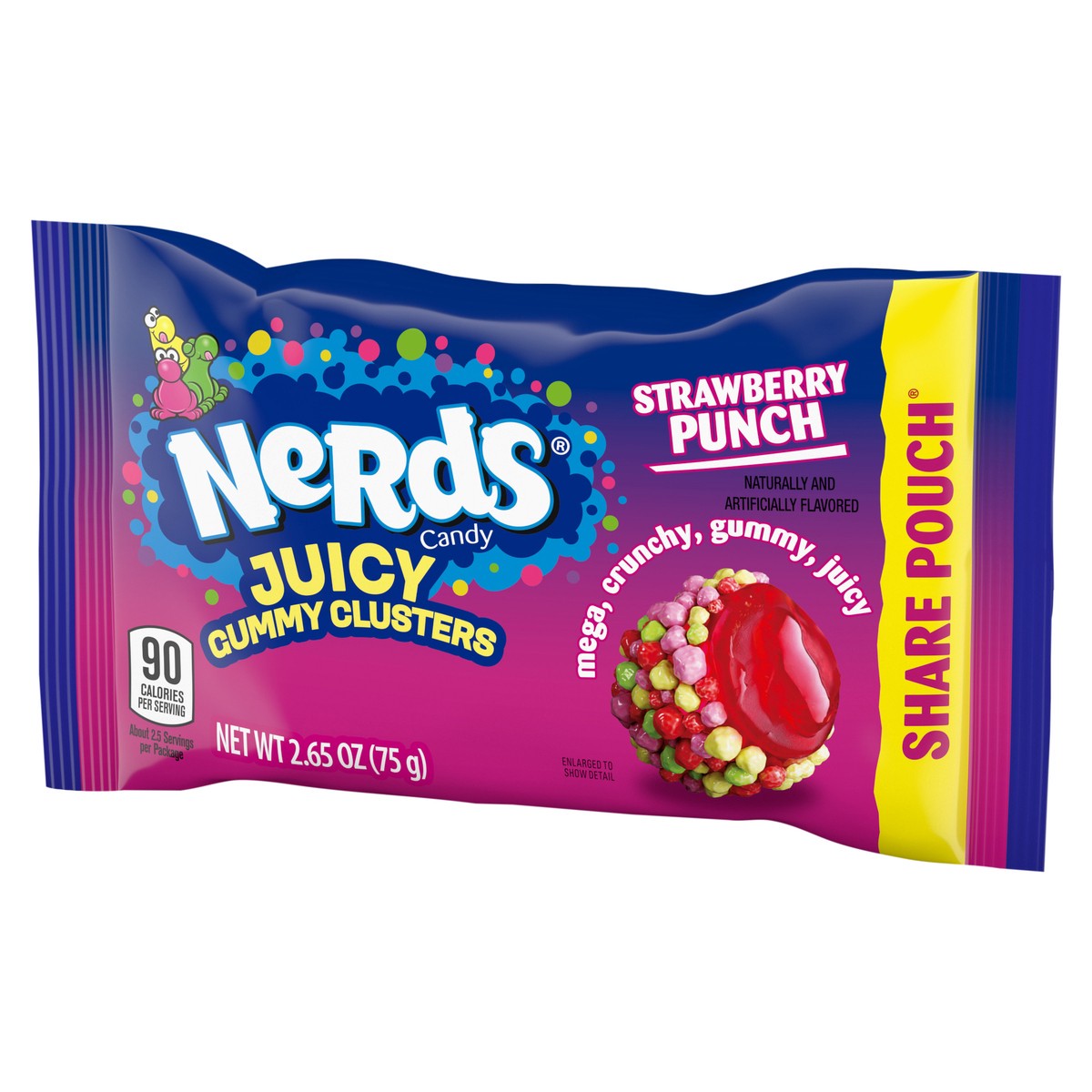 Explore the mega-crunchy-gummy-juicy world of NERDS Juicy Gummy Clusters. With colorful NERDS surrounding a fruity gummy inside and a juicy center, our Strawberry Punch flavored candy is a triple-text…