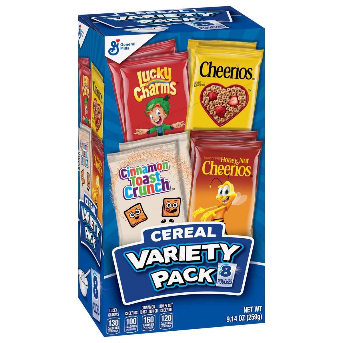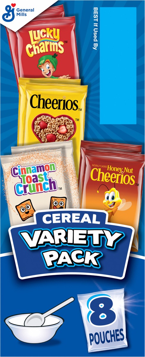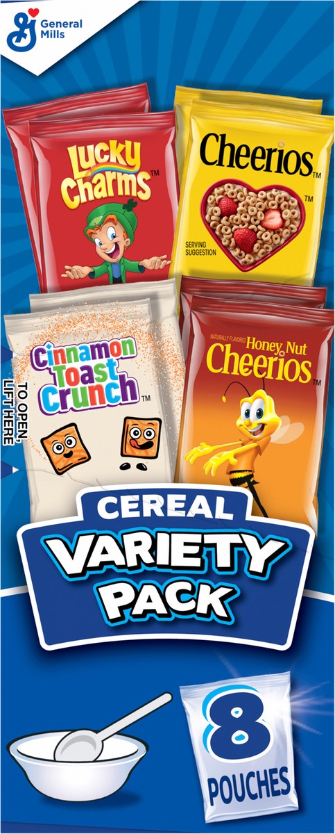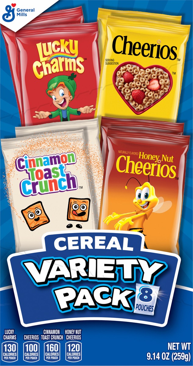 General Mills Breakfast Cereal Variety Pack, Lucky Charms, Cinnamon Toast Crunch, Cheerios, and Honey Nut Cheerios, 8 Pouches, 9.14 oz