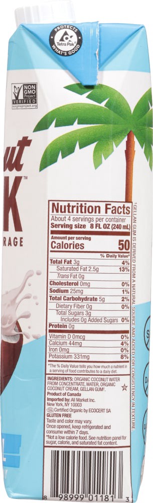Non-dairy beverage. USDA Organic. Certified Organic by Ecocert SA. No gluten. Gluten free. No added sugar (Not a low calorie food. See nutrition panel for sugar, calorie, and saturated fat content). N…