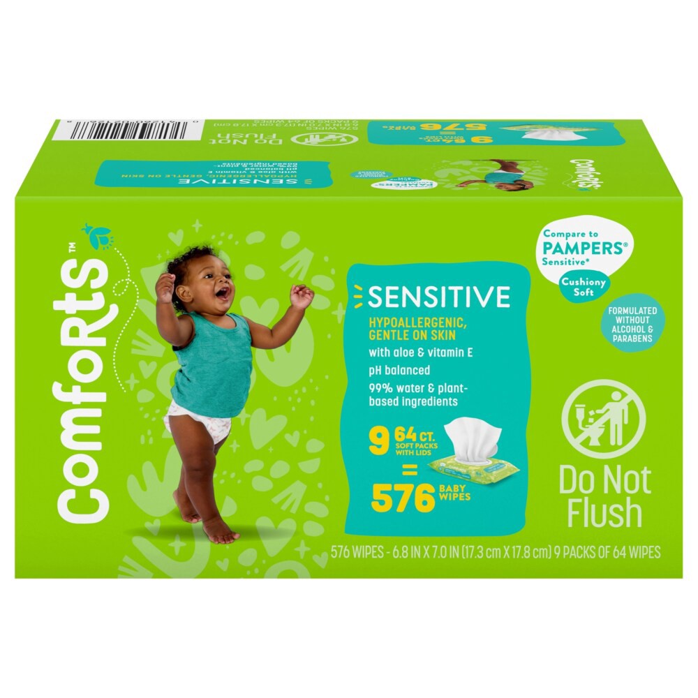 Comforts™ Sensitive Baby Wipes offer gentle cleansing for baby. These hypoallergenic wipes are made from cushiony soft, 99% water and plant-based ingredients for easy cleaning and care. They contain t…