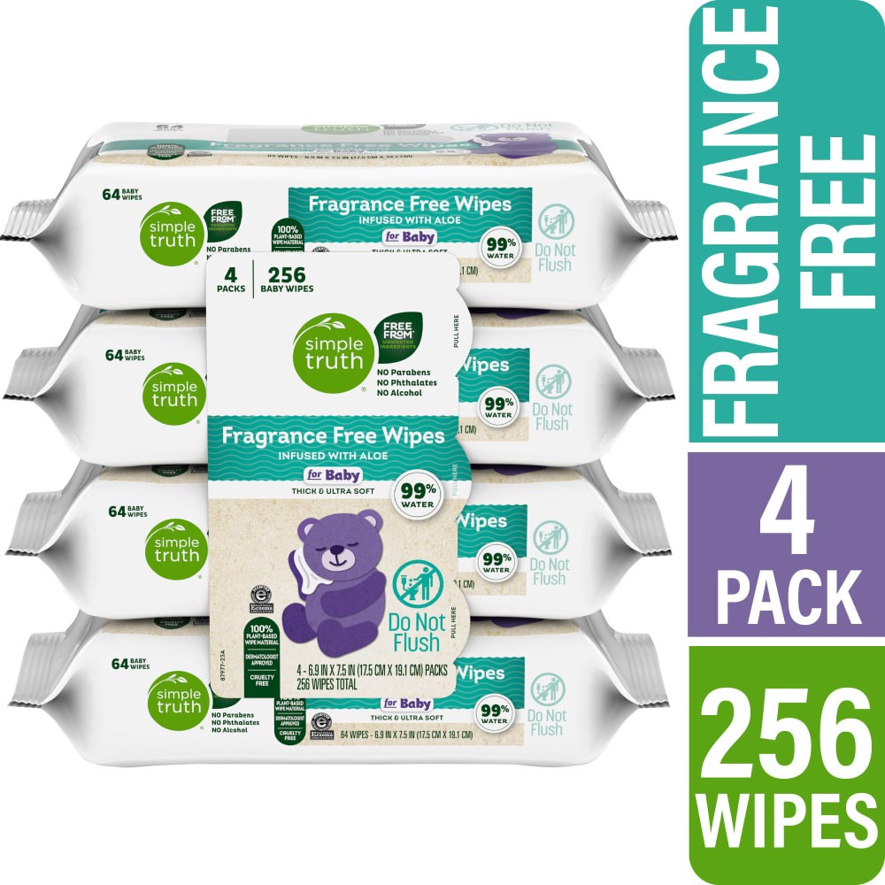 Simple Truth® Fragrance Free Baby Wipes deliver gentle and effective cleaning with 99% water and the silky touch of aloe. Derived from 100% plant-based wipe materials, these wipes are thick & ultra so…
