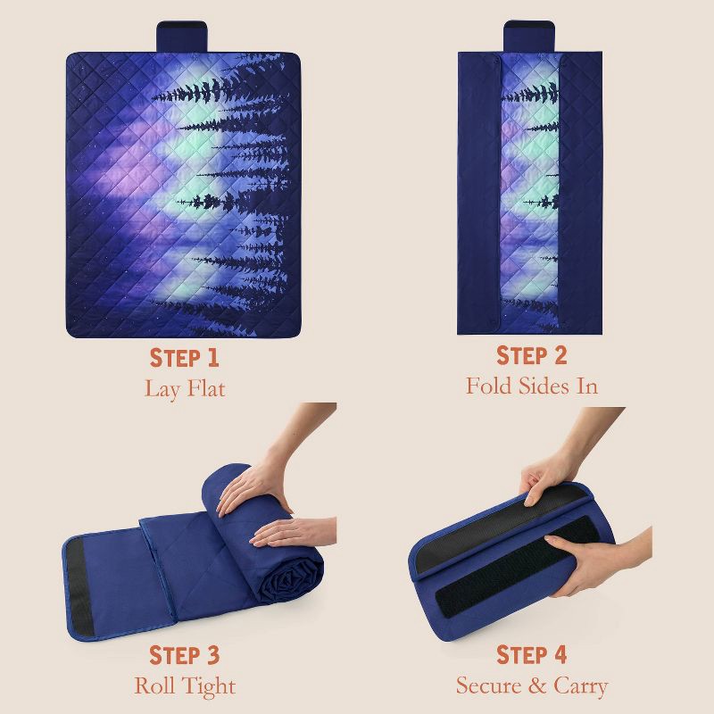 - Easy Roll-Up Design with Corner Loops: Roll-up picnic blanket with Velcro closure, carry handle, and four corner loops to help secure it on the ground outdoors