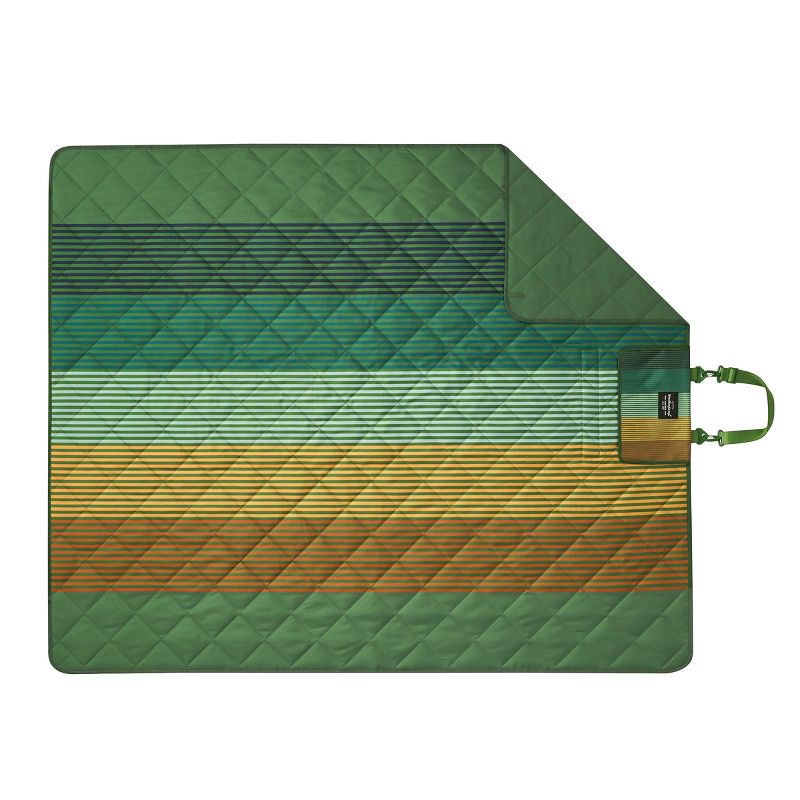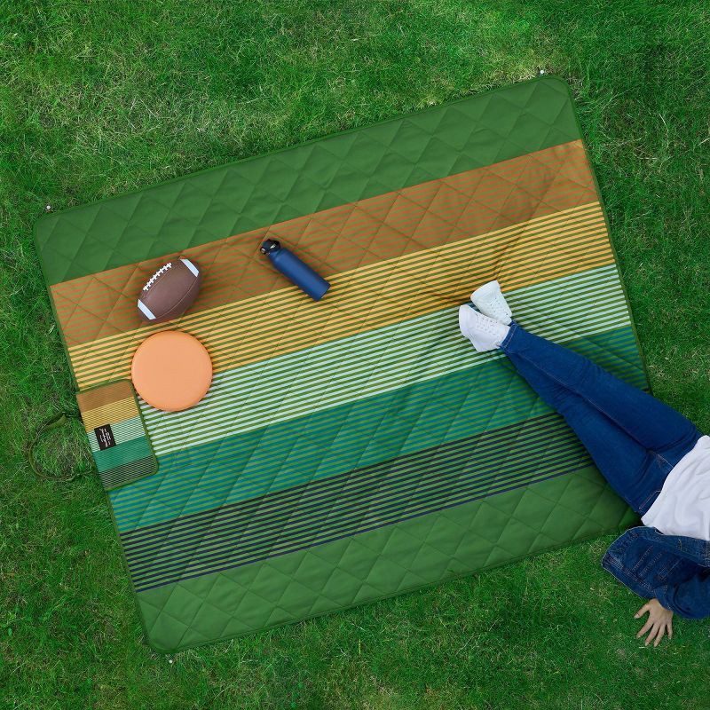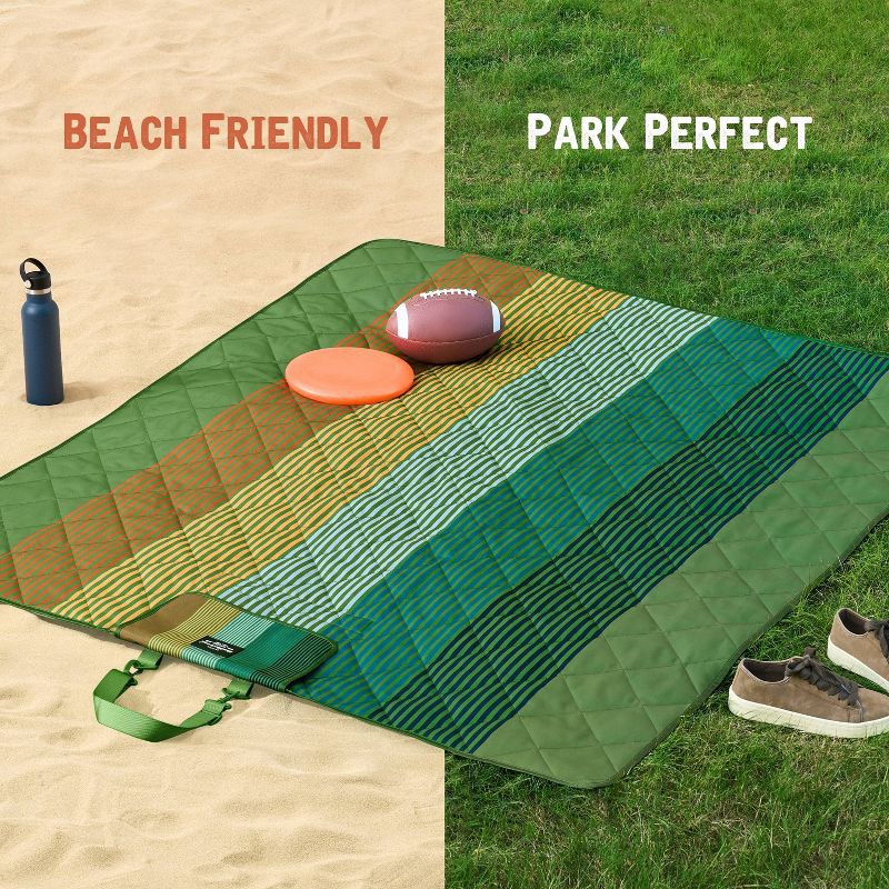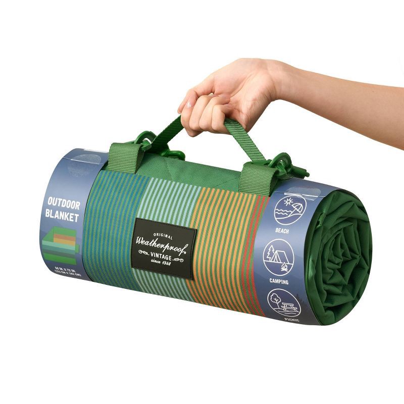 - Weatherproof Vintage Outdoor Picnic Blanket with Strap & Velcro Closure, Roll-Up Beach or Camping Blanket, Green Stripes, 60"x72"