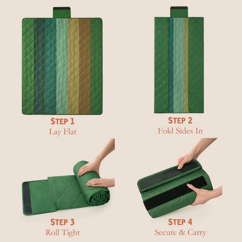 - Easy Roll-Up Design with Corner Loops: Roll-up picnic blanket with Velcro closure, carry handle, and four corner loops to help secure it on the ground outdoors