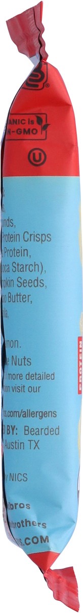 Dates*, Almonds*, Pea Protein Crisps* (Pea Protein*, Tapioca Starch*), Pumpkin Seeds*, Cacao Butter*, Vanilla*, Sea Salt, Cinnamon*. * Denotes Organic Ingredients.