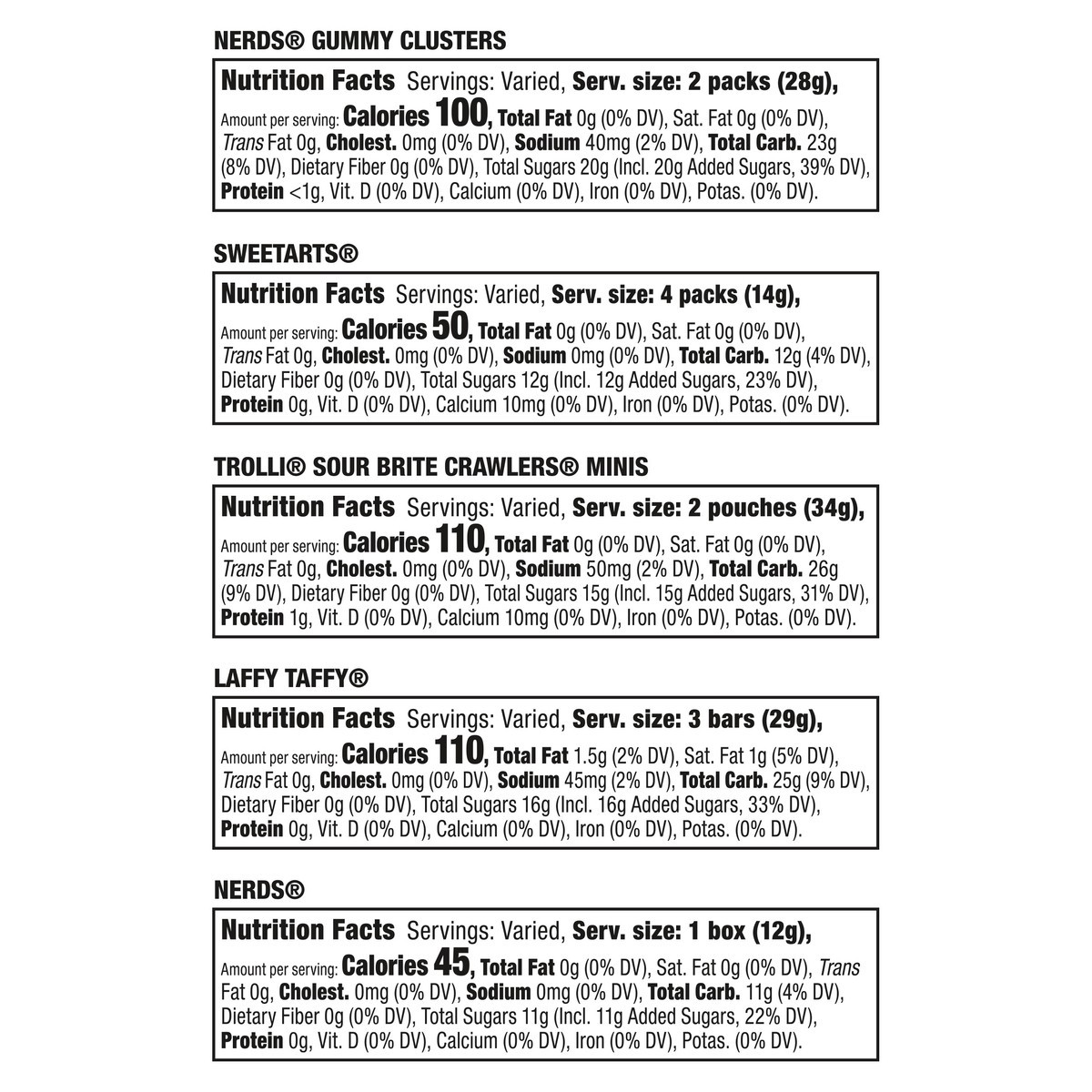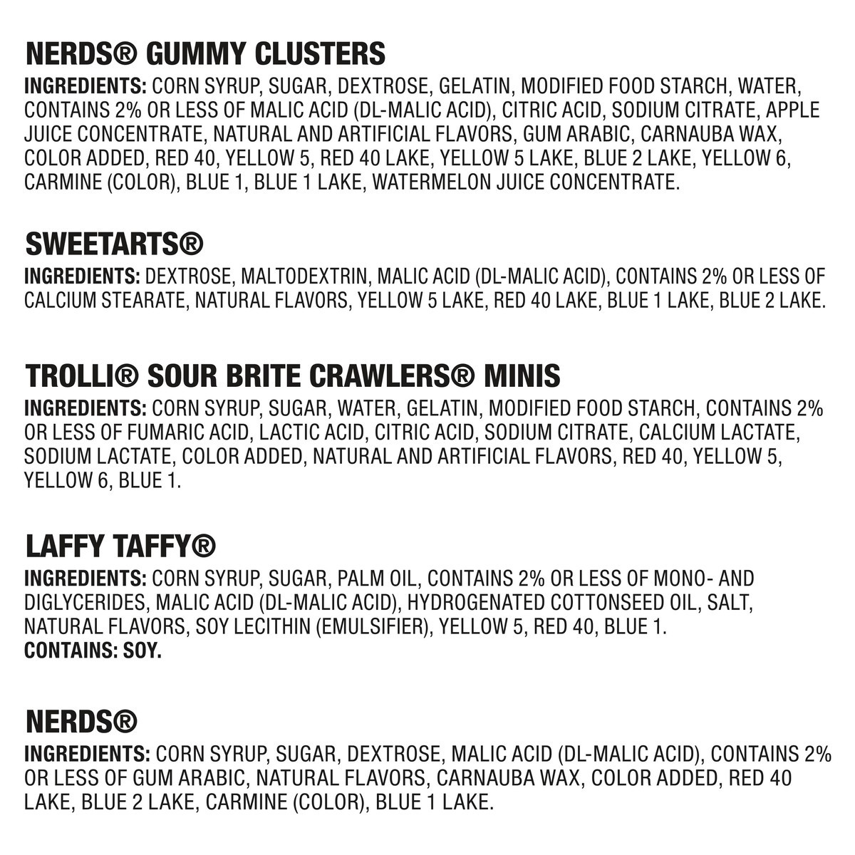 Nerds Gummy Clusters: Corn Syrup, Sugar, Dextrose, Gelatin, Modified Food Starch, Water, Contains 2% or Less of Malic Acid (DL-Malic Acid), Citric Acid, Sodium Citrate, Apple Juice Concentrate, Natura…