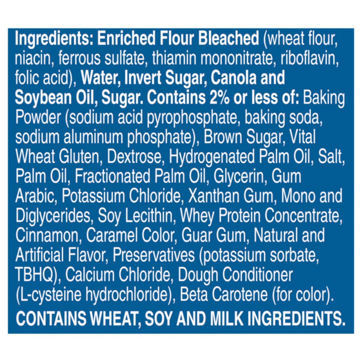 Enriched Flour Bleached (Wheat Flour, Niacin, Ferrous Sulfate, Thiamin Mononitrate, Riboflavin, Folic Acid), Water, Invert Sugar, Canola and Soybean Oil, Sugar, Contains 2% or Less of: Baking Powder (…