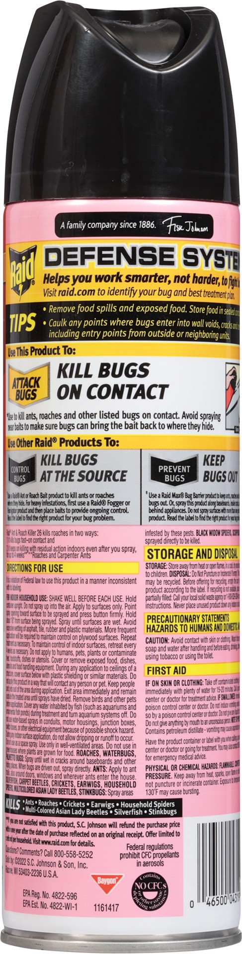 Raid Ant & Roach Aerosol Spray kills bugs on contact and keeps killing insects for up to 4 weeks. Raid helps protect your family from a variety of crawling insects including cockroaches, waterbugs, pa…