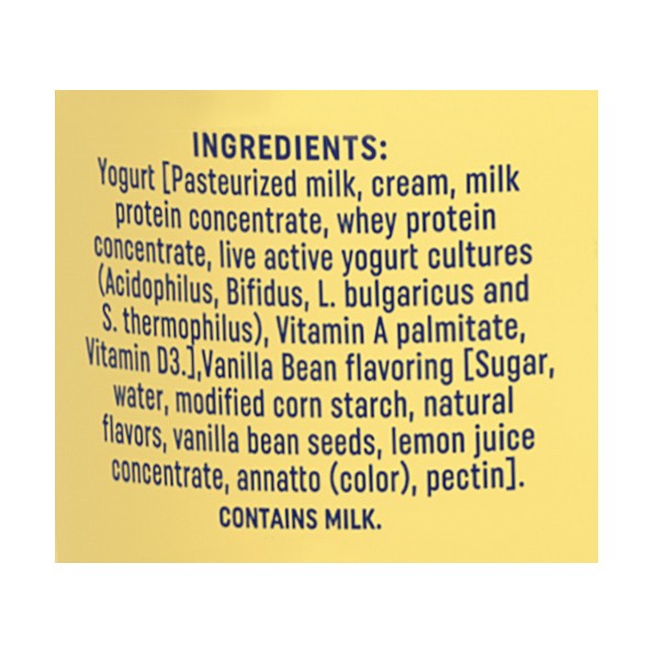 Yogurt [Pasteurized milk, cream, milk protein concentrate, whey protein concentrate, live active yogurt cultures (Acidophilus, Bifidus, L. bulgaricus and S. thermophilus), Vitamin A palmitate, Vitamin…