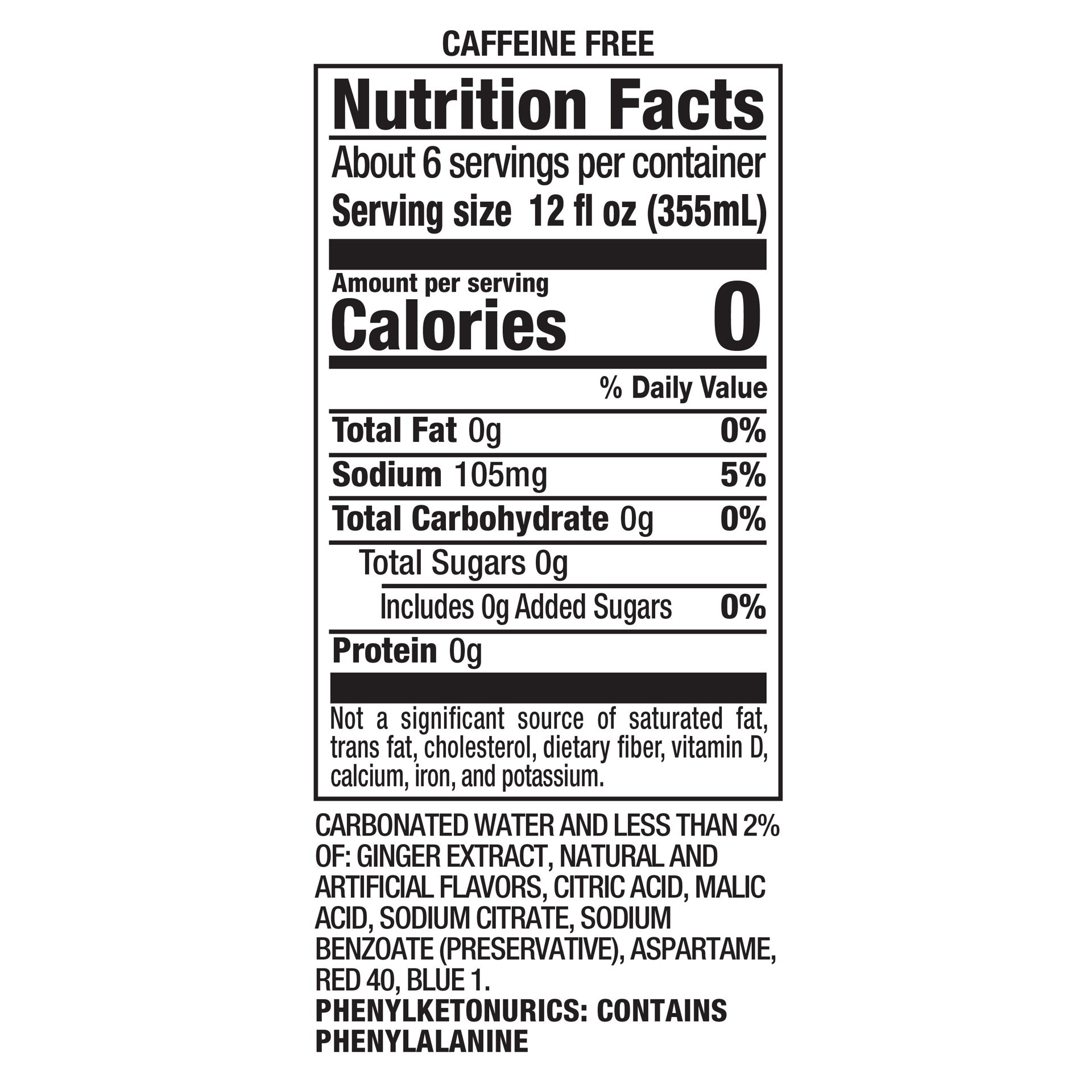 Carbonated Water and Less than 2% of: Ginger Extract, Natural and Artificial Flavors, Citric Acid, Malic Acid, Sodium Citrate, Sodium Benzoate (Preservative), Aspartame, Red 40, Blue 1.