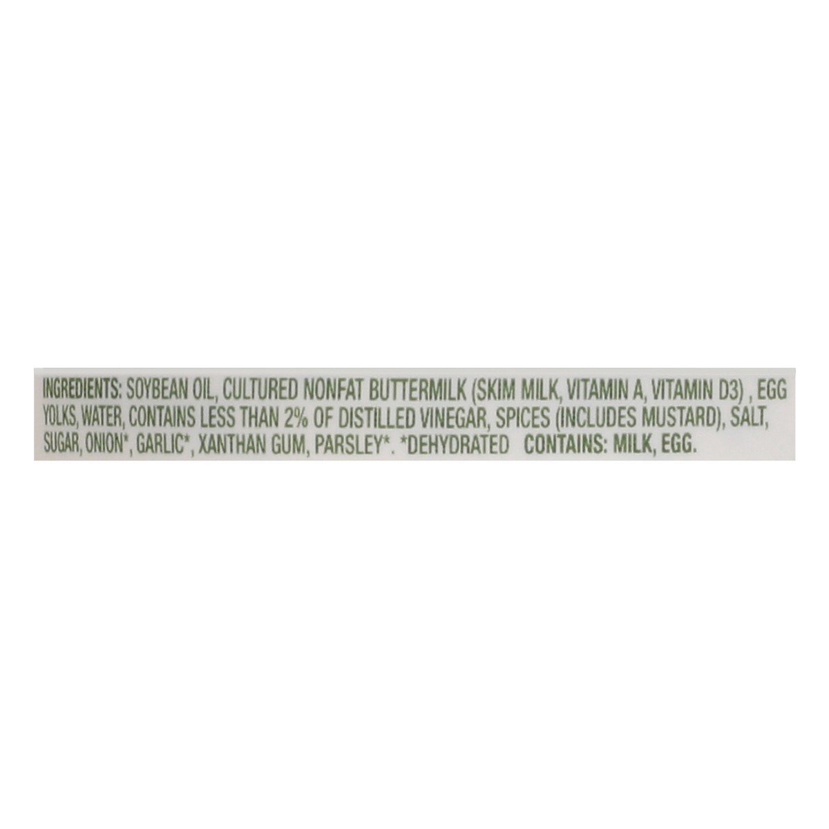 Soybean Oil, Cultured Nonfat Buttermilk (Skim Milk, Vitamin A, Vitamin D3), Egg Yolks, Water, Contains Less than 2% of Distilled Vinegar, Spices (Includes Mustard), Salt, Sugar, Onion (Dehydrated), Ga…