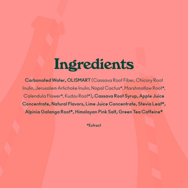 Carbonated Water, Olismart (Cassava Root Fiber, Chicory Root Inulin, Jerusalem Artichoke Inulin, Nopal Cactus*, Marshmallow Root*, Calendula Flower*, Kudzu Root*), Cassava Root Syrup, Apple Juice Conc…