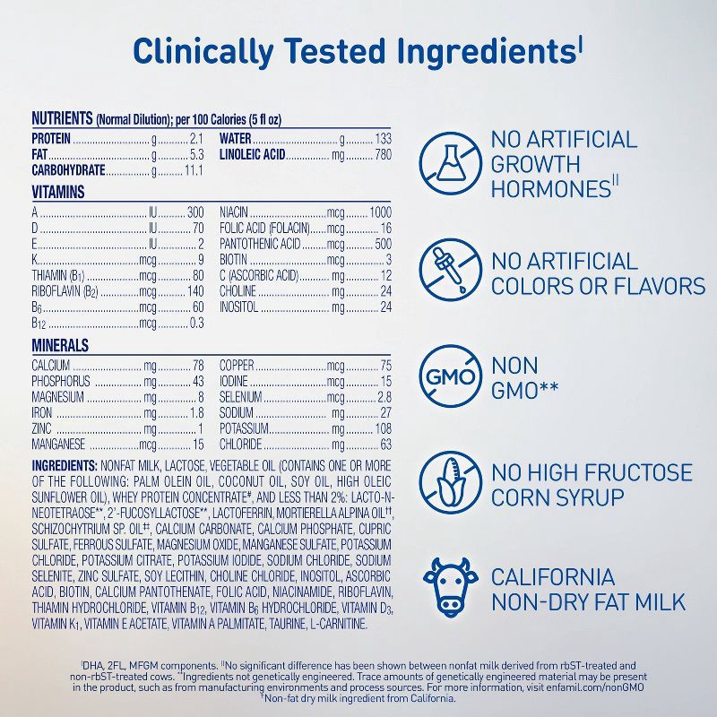 - NO ARTIFICIAL ADDITIVES & NON-GMO: Has clinically-tested, non-GMO ingredients. Free from artificial growth hormones, colors, and flavors. Enfamil Optimum does not contain high fructose corn syrup and is made with milk sourced from the United States. Optimum is premium baby formula for infants through 12 months of age.