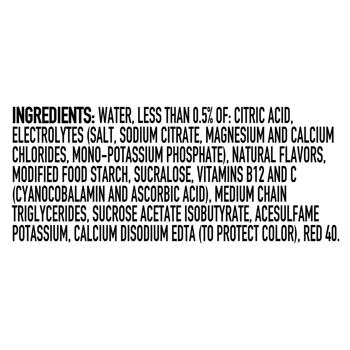 Water\, Less than 0.5% of: Citric Acid\, Electrolytes (Salt\, Sodium Citrate\, Magnesium and Calcium Chlorides\, Mono-Potassium Phosphate)\, Natural Flavors\, Modified Food Starch\, Sucralose\, Vitami…