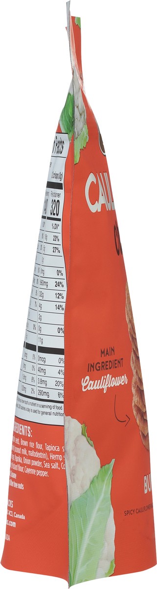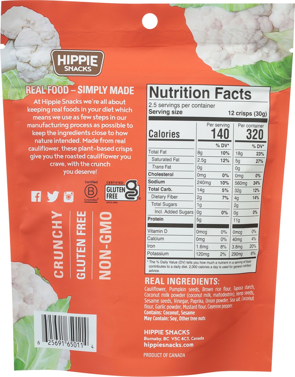 Cauliflower, Pumpkin Seeds, Brown Rice Flour, Tapioca Starch, Coconut Milk Powder (Coconut Milk, Maltodextrin), Hemp Seeds, Sesame Seeds, Vinegar, Paprika, Onion Powder, Sea Salt, Coconut Flour, Garli…