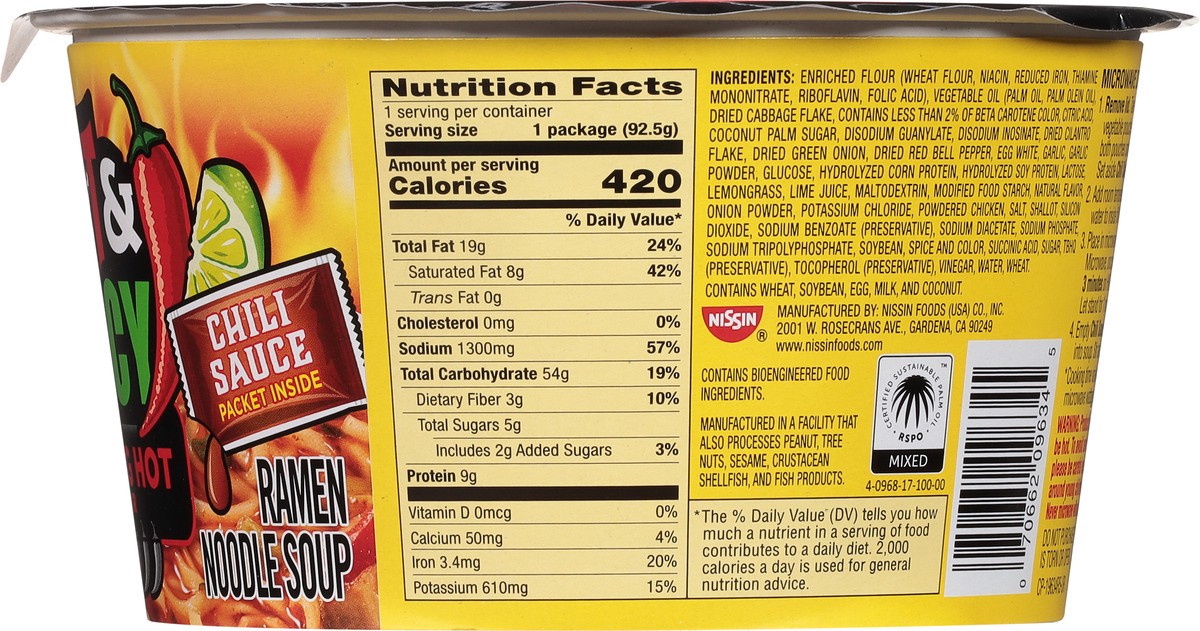 Chili sauce packet inside. Ready in 3 minutes! No added MSG (Contains small amounts of naturally occurring glutamates). RSPO: Certified sustainable palm oil.