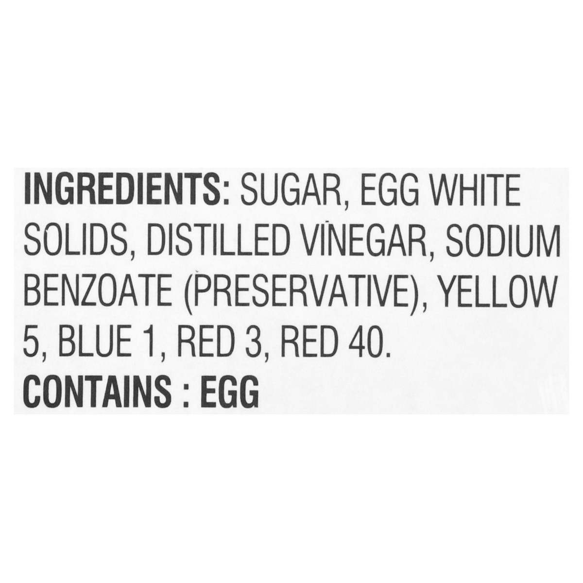 Sugar, Egg White Solids, Distilled Vinegar, Sodium Benzoate (Preservative), Yellow 5, Blue 1, Red 3, Red 40.