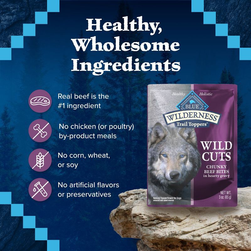 - Contains: one (1) 3-oz. pouches of BLUE Wilderness Trail Toppers Wet Dog Food, Chunky Beef Bites in Hearty Gravy