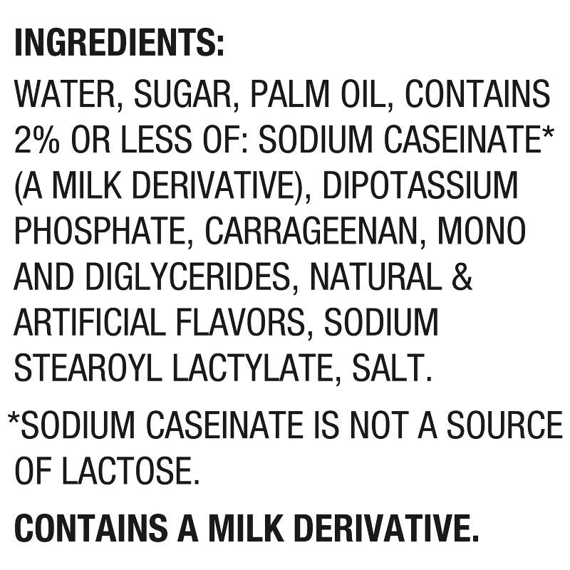 WATER, SUGAR, PALM OIL, CONTAINS 2% OR LESS OF: SODIUM CASEINATE* (A MILK DERIVATIVE), DIPOTASSIUM PHOSPHATE, CARRAGEENAN, MONO AND DIGLYCERIDES, NATURAL & ARTIFICIAL FLAVORS, SODIUM STEAROYL LACTYLAT…