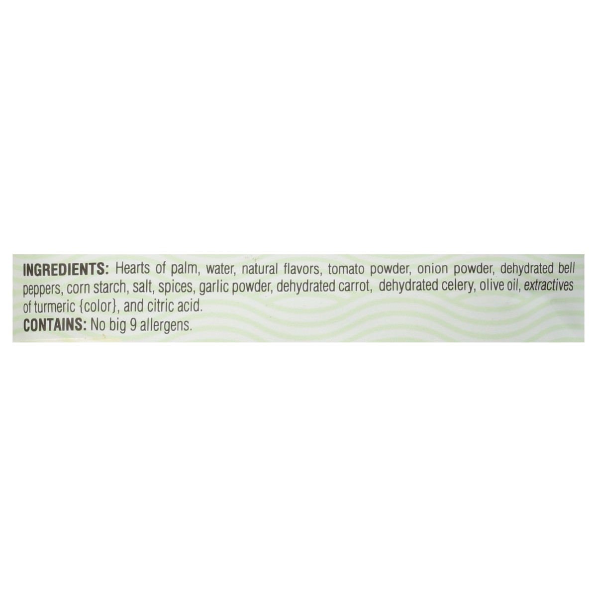 Hearts of Palm, Water, Natural Flavors, Tomato Powder, Onion Powder, Dehydrated Bell Peppers, Corn Starch, Salt, Spices, Garlic Powder, Dehydrated Carrot, Dehydrated Celery, Olive Oil, Extractives of …