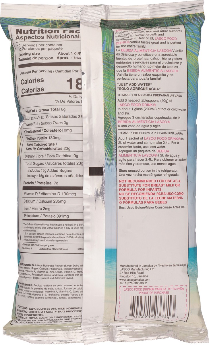 Just add water. Makes 81.15 oz (2.4 l). Lasco Food Drink Vanilla is a delicious beverage which is a good source of protein, calcium, iron and other nutrients essential for human growth and developmentā¦