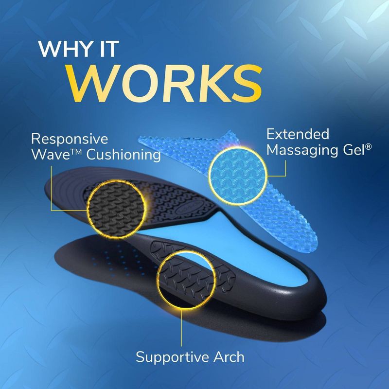 - Extended Massaging Gel® - The only insole with extended gel cushioning that reduces the impact to muscles & joints on hard surfaces
