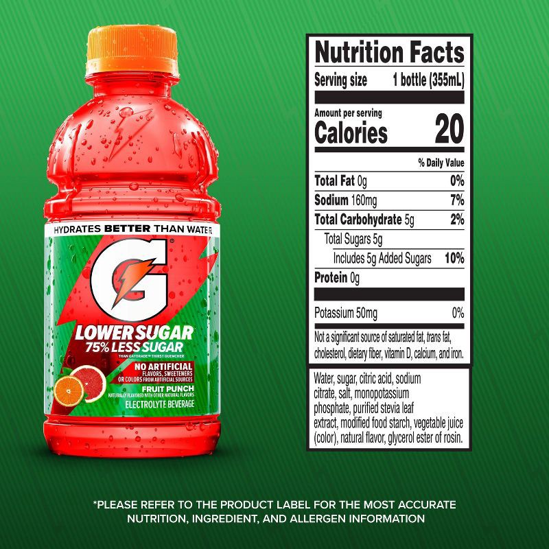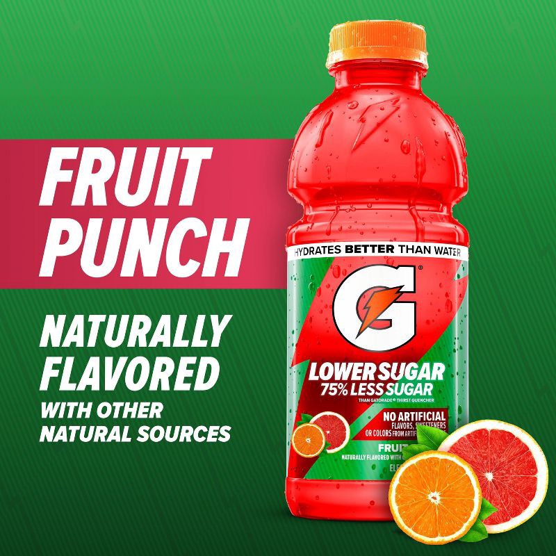 - Includes 12(12 fl oz) bottle of Gatorade Lower Sugar Electrolyte Sports Drink made with 75% lower sugar than regular Gatorade, Fruit Punch flavor