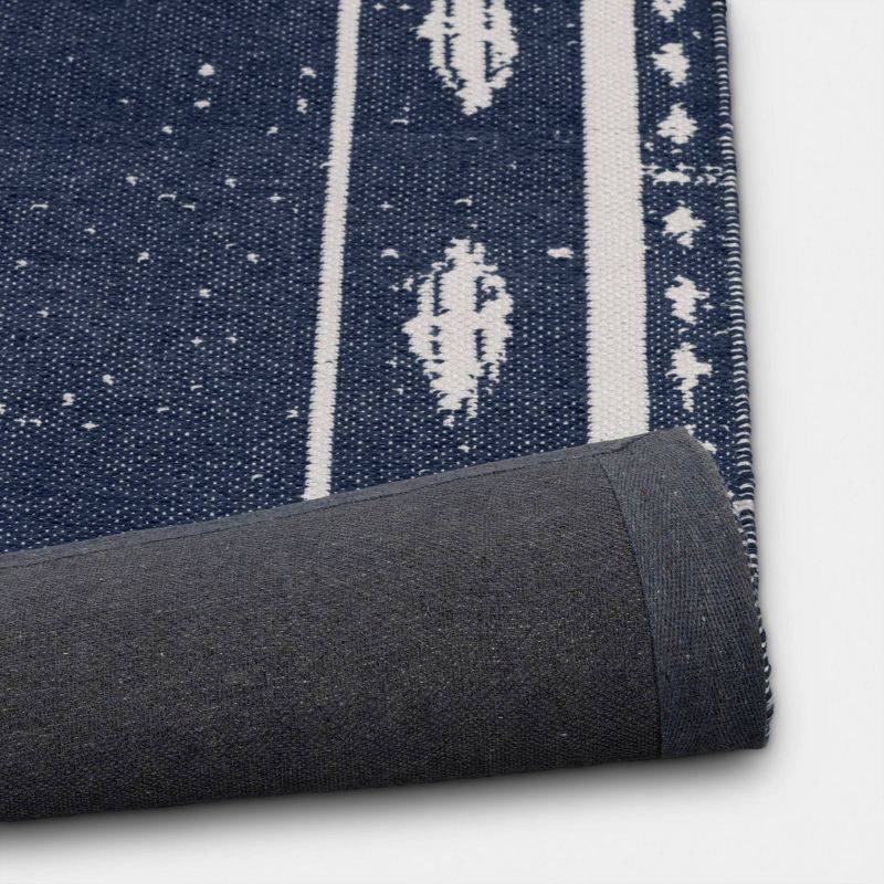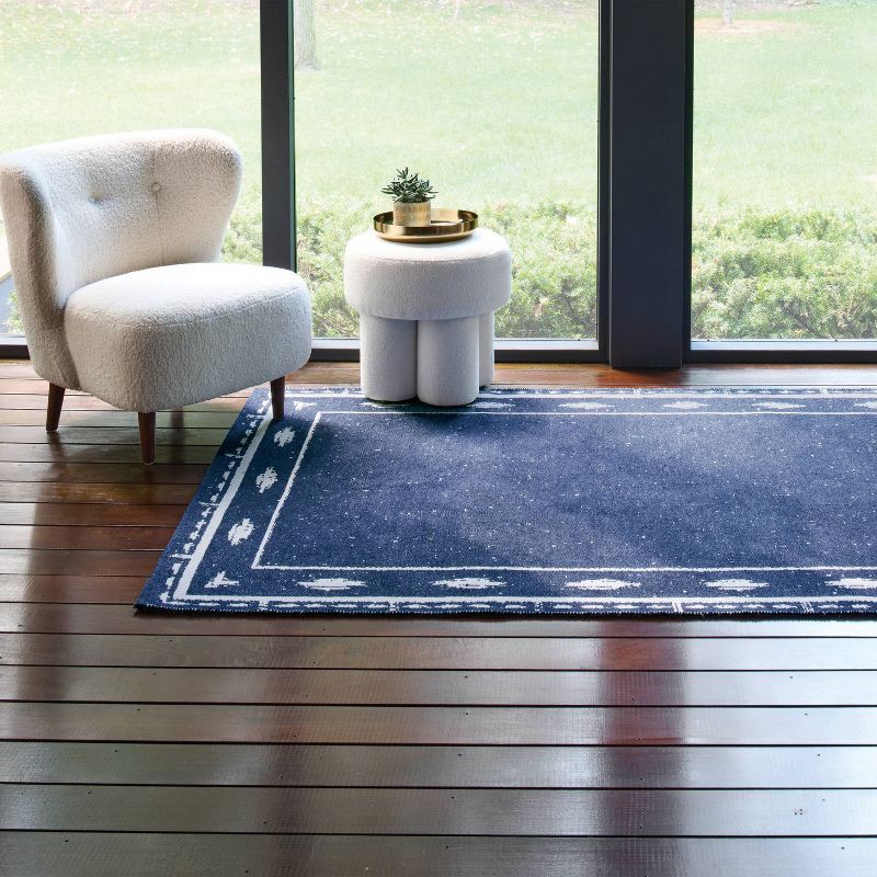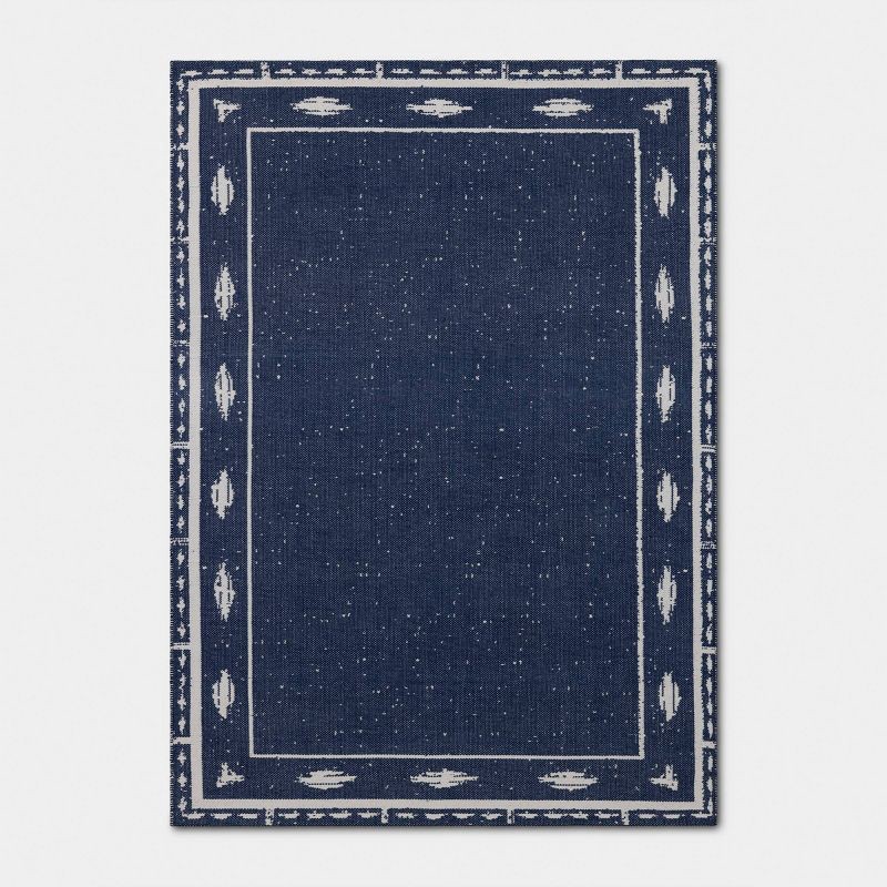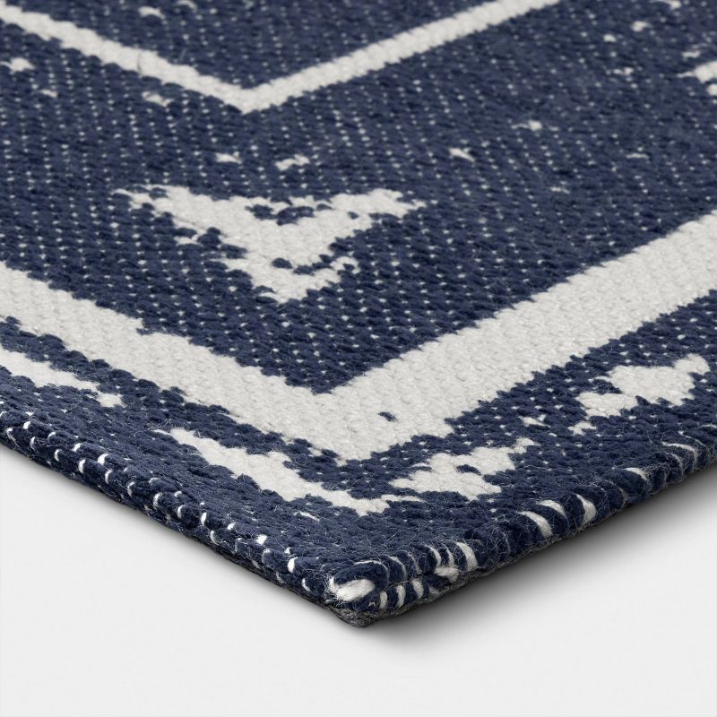 Add depth and visual interest to your home decor with this Ikat Woven Area Rug from Threshold™. This flat-pile rug features ikat border print on a blue backdrop, complemented by a distressed pattern f…