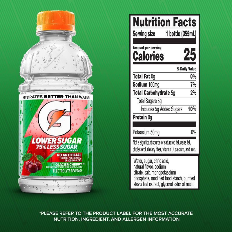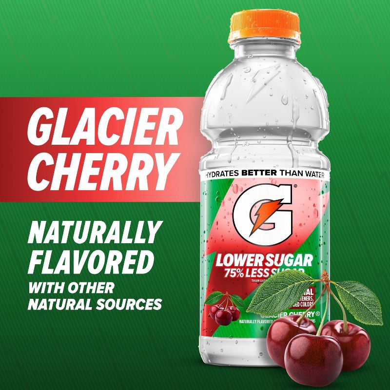 - Includes 12 (12 fl oz) bottles of Gatorade Lower Sugar Electrolyte Sports Drink made with 75% lower sugar than regular Gatorade, Glacier Cherry flavor
