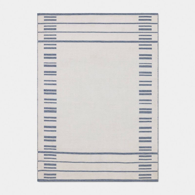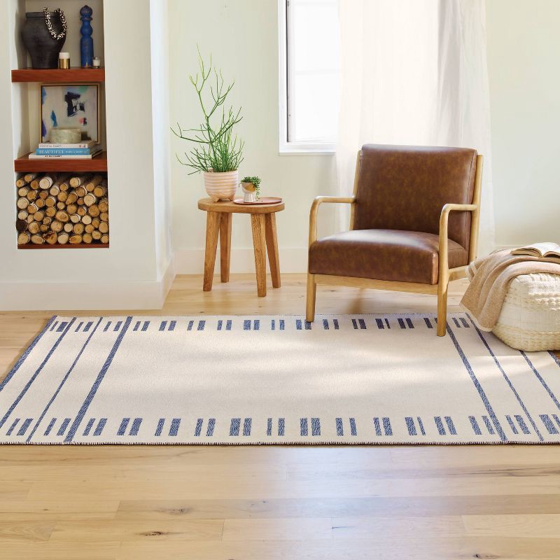 Enhance your home decor with this Broken Striped Woven Area Rug from Threshold™. This flat-pile area rug features three blue stripes along the border, complemented by broken stripes on a cream hue bac…
