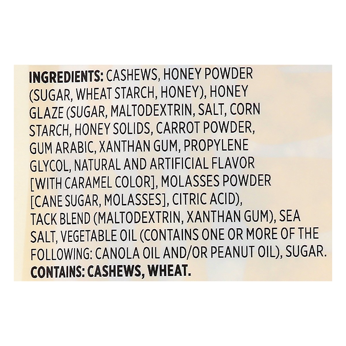 Cashews, Honey Powder (Sugar, Wheat Starch, Honey), Honey Glaze (Sugar, Maltodextrin, Salt, Corn Starch, Honey Solids, Carrot Powder, Gum Arabic, Xanthan Gum, Propylene Glycol, Natural and Artificial …